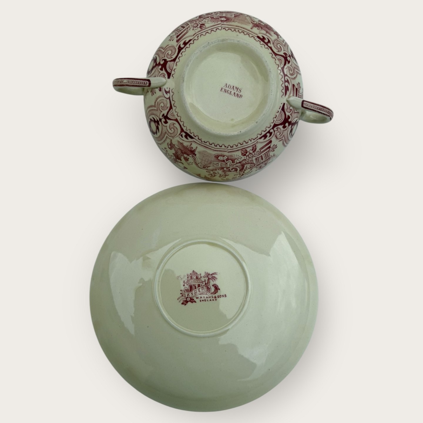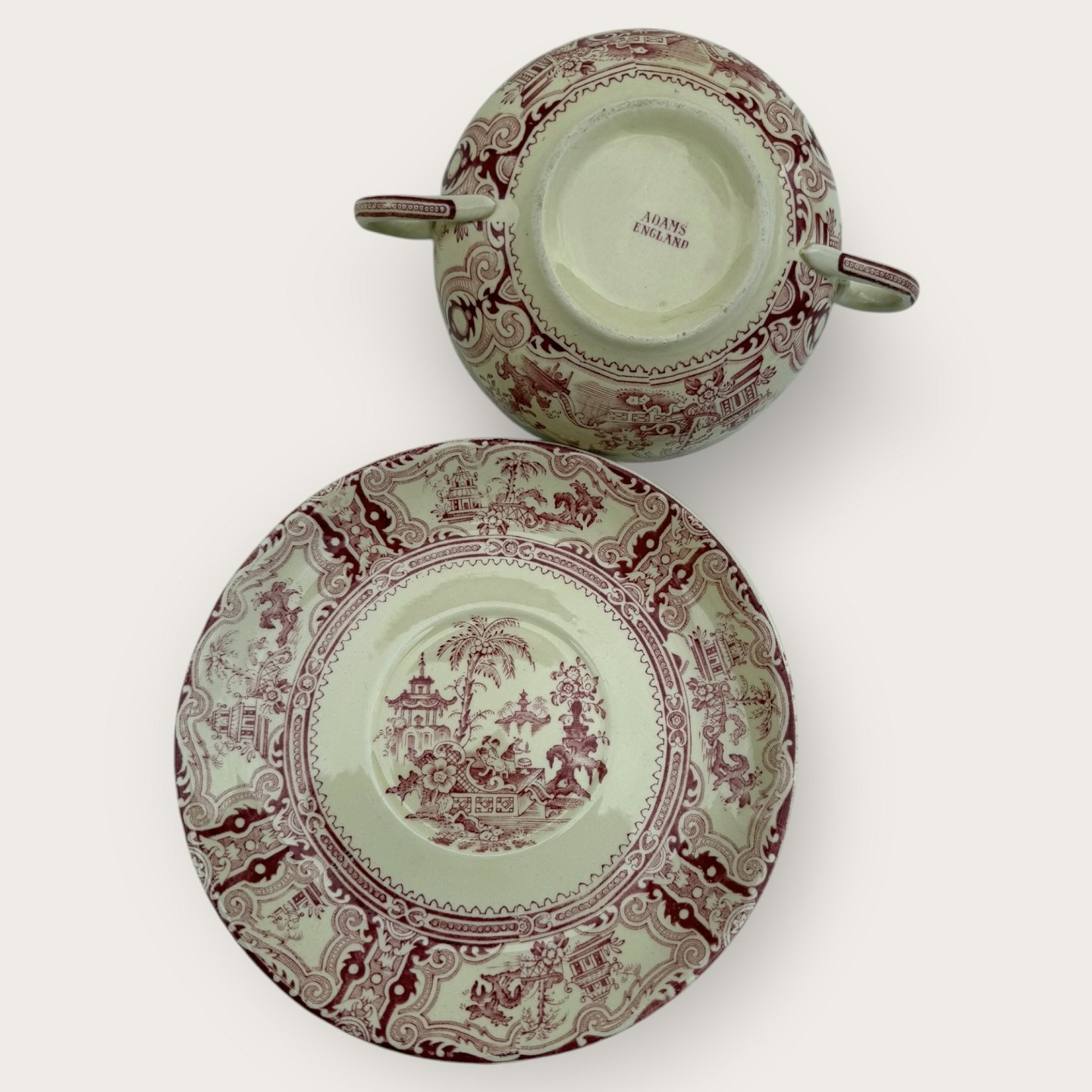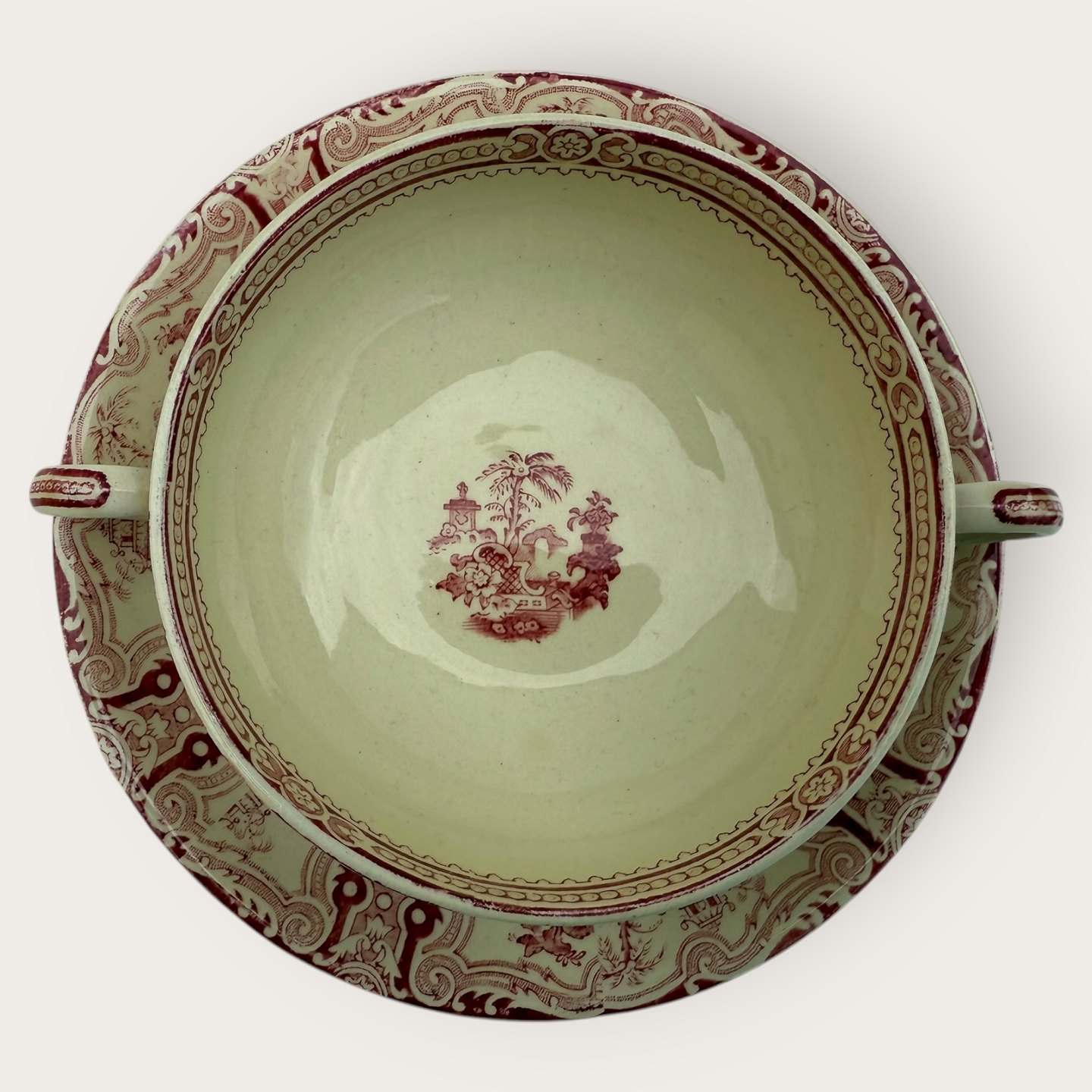 William Adams, Kyber with red Chinese motif, Bouillon cup, Cup diameter 12cm, saucer 17cm, good used condition.Stock: 6