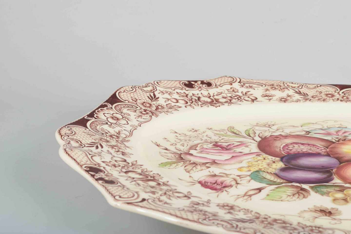 Johnson Bros. Very large Serving Platter, early-20th century.Rectangular platter with rounded corners in earthenware. Decorated with a central multicolored transfer print of fruit and flowers, framed by a brown ornamental border along the rim.
