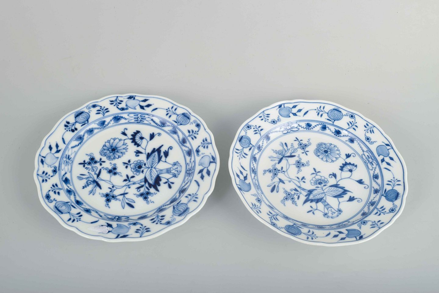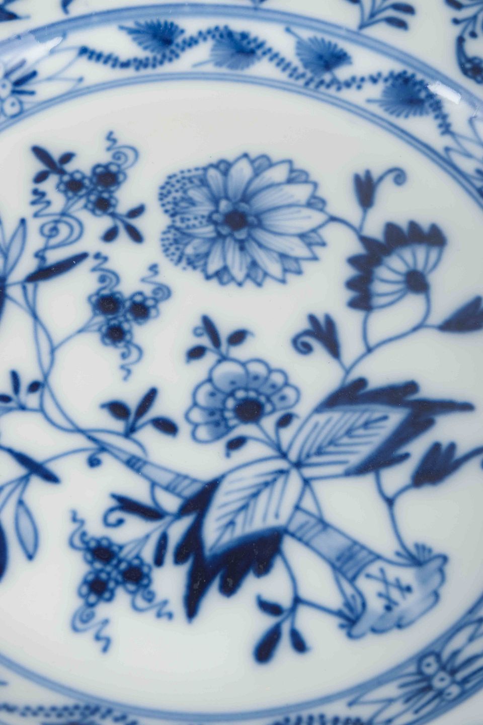 Porcelain plates with the classic Blue Onion decoration, hand-painted in cobalt blue underglaze. Decorated with floral and foliage motifs and a scalloped rim.