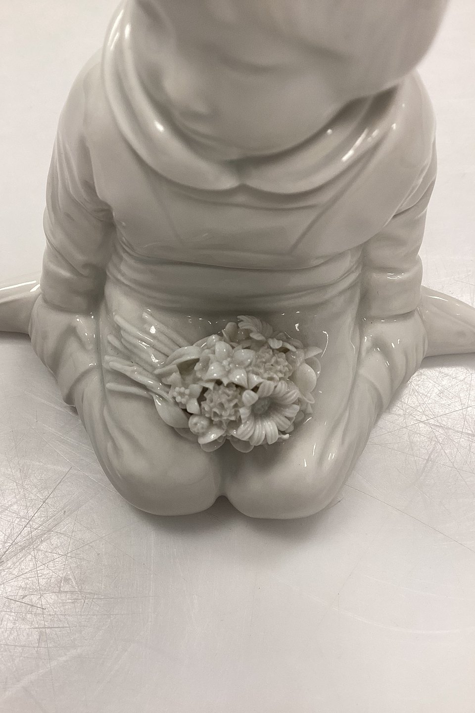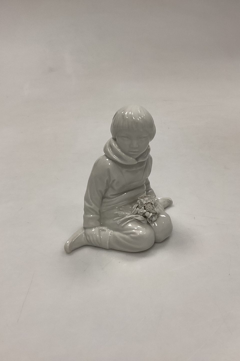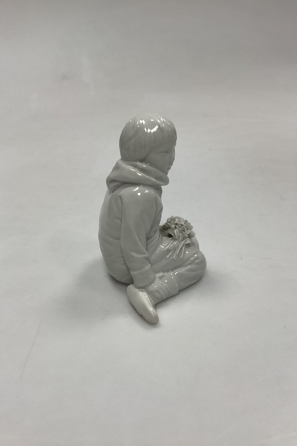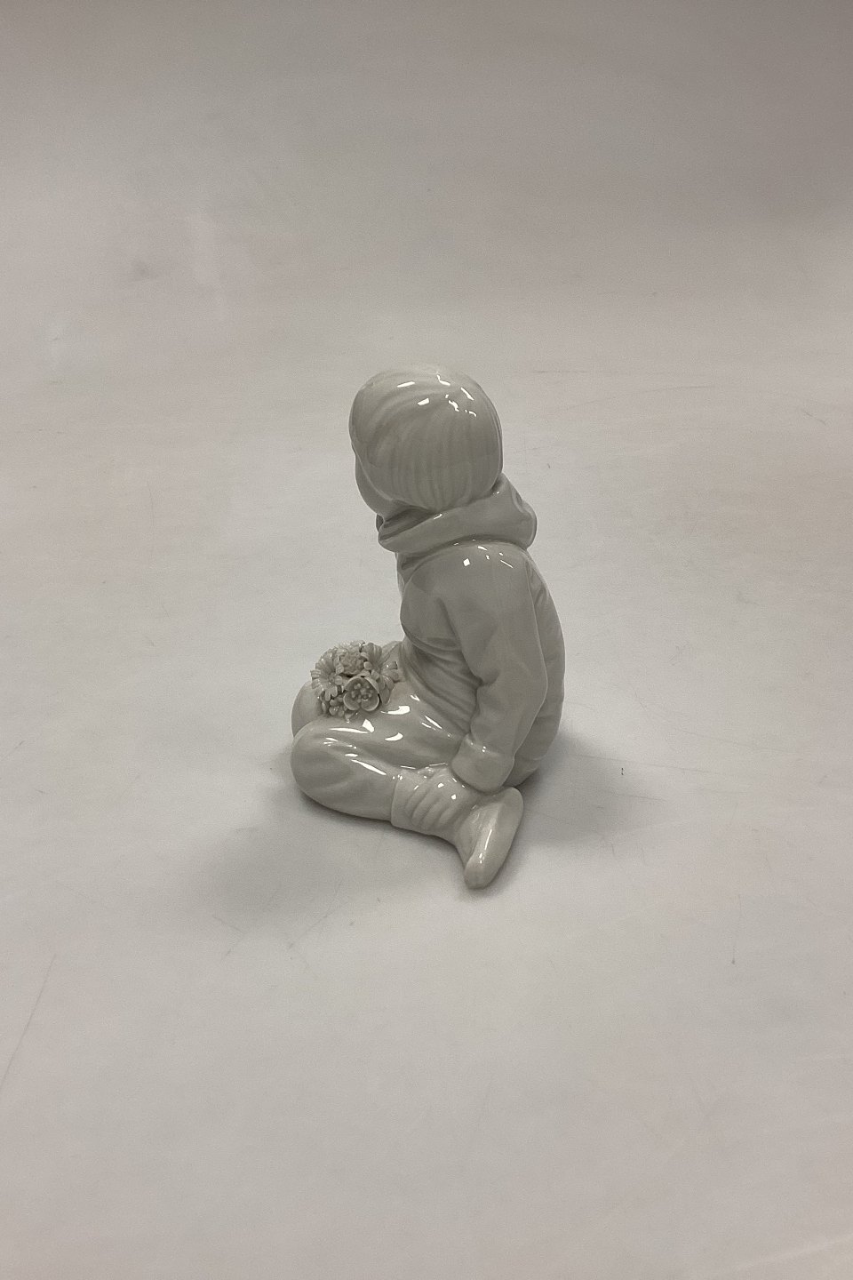 Royal Copenhagen Blanc de Chine Figurine - Boy with Flowers from Greenland No. 12419. Designed by Carl Martin-Hansen. A few minor chips on flowers. Measures 9.5 cm / 3.74 in. 1st QualityStock: 1