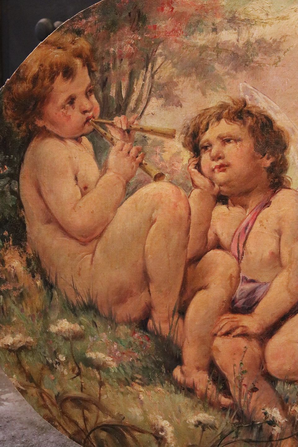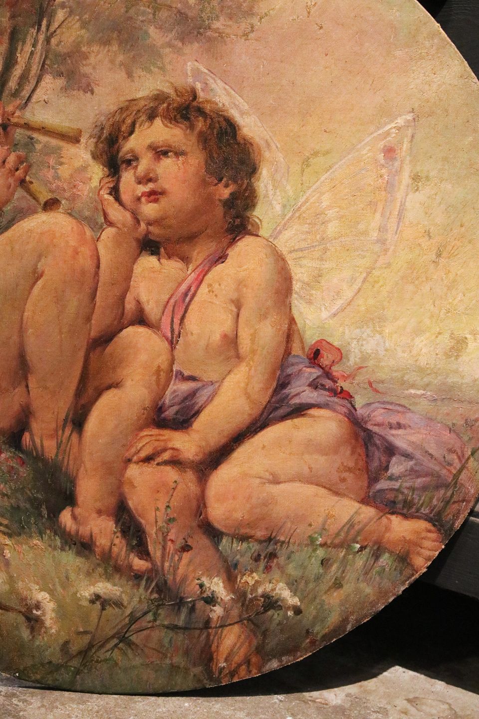 Old French 1800s oil painting on canvas with a motif of 2 small angels. The painting (the canvas is fixed on a wooden board) Dia.: 57cm.Item number: Engle maleri 1