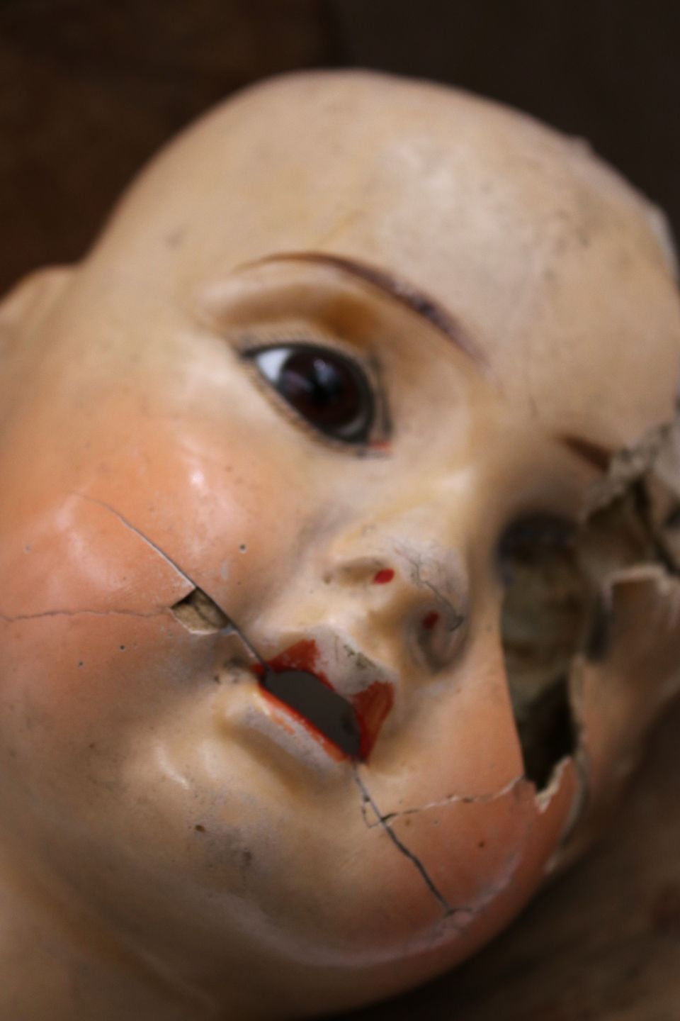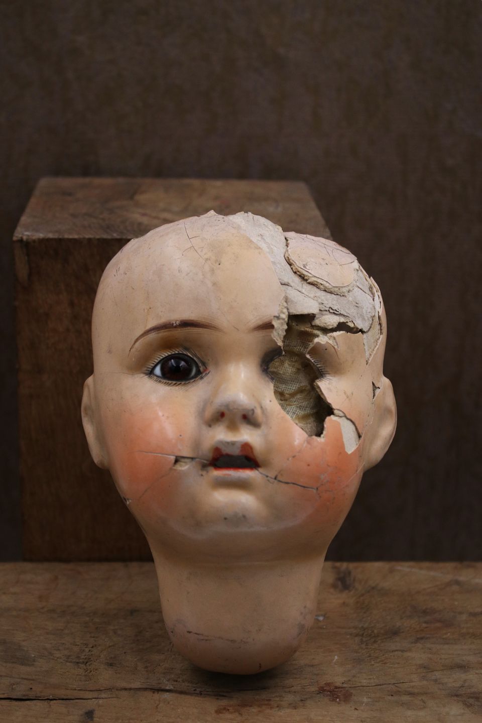 Old doll head in painted papier-mâché.The doll's head is broken on one side, with decorative decay in all its appearance like a small art installation. H: 17cm. Dia.: 12cm.