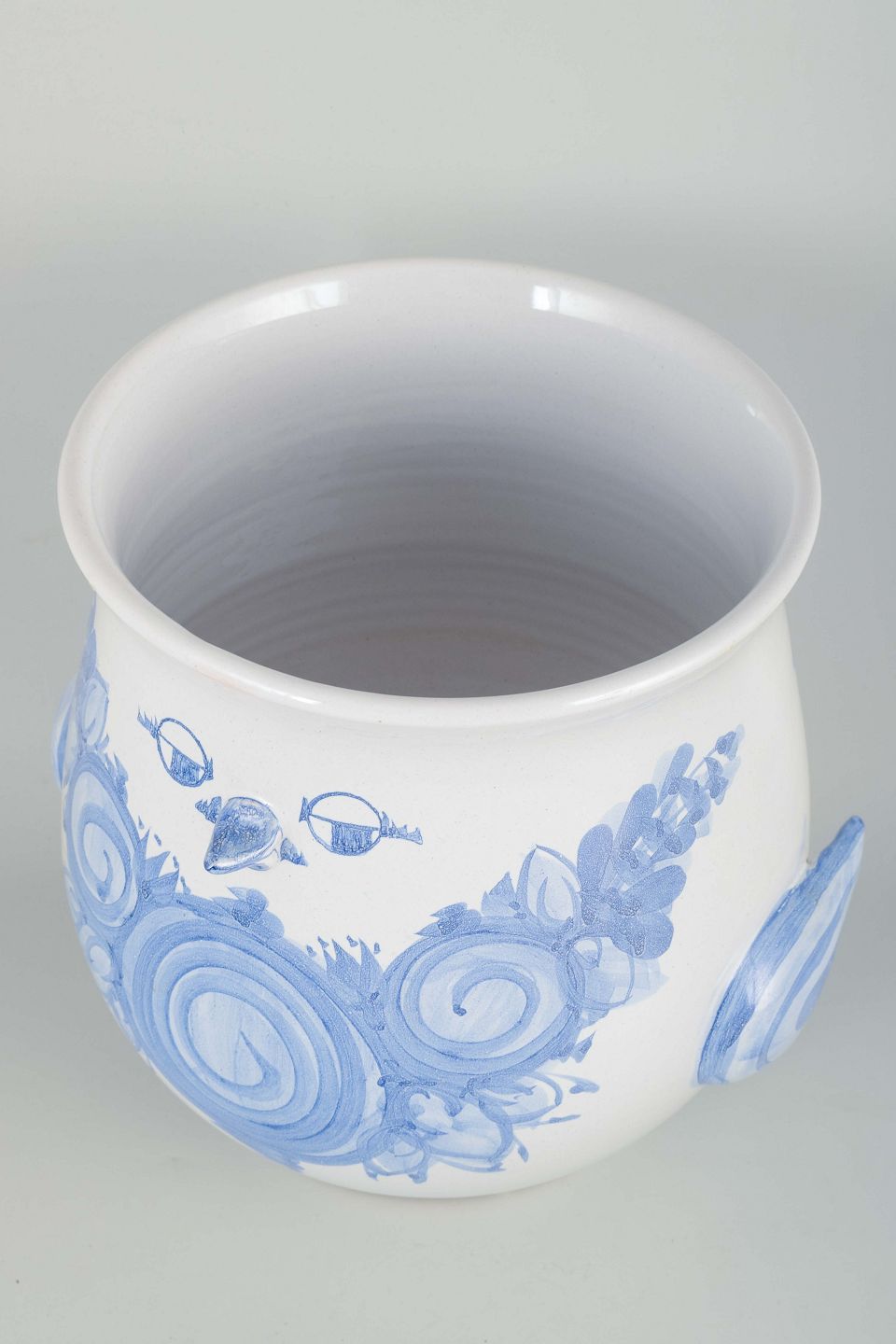 Organically shaped flowerpot cover in white-glazed faience with hand-painted blue spiral and floral motifs.