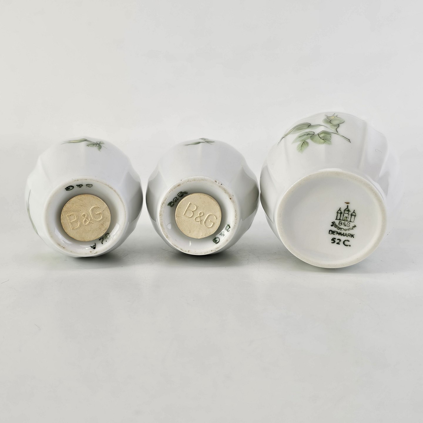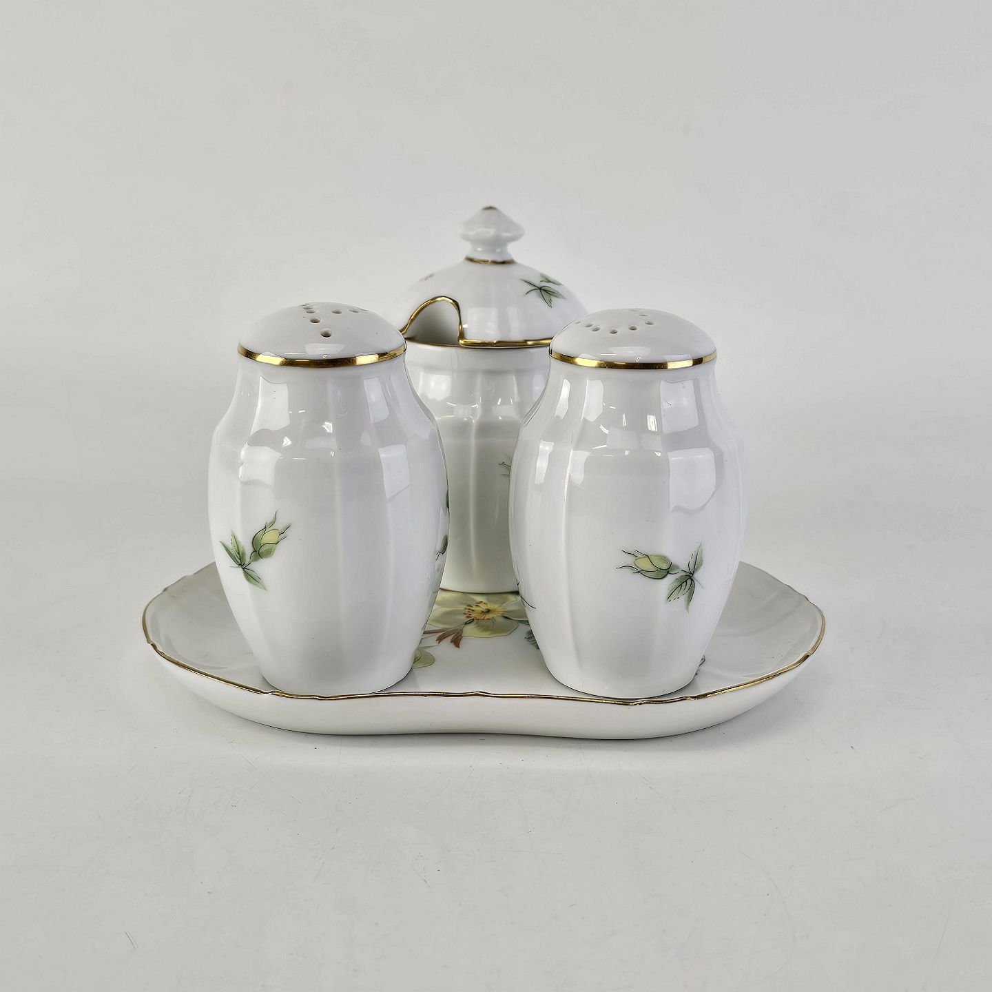 Sæt til salt, peber og sennep med tilhørende tallerken i porcelæn fra stellet Klitrose