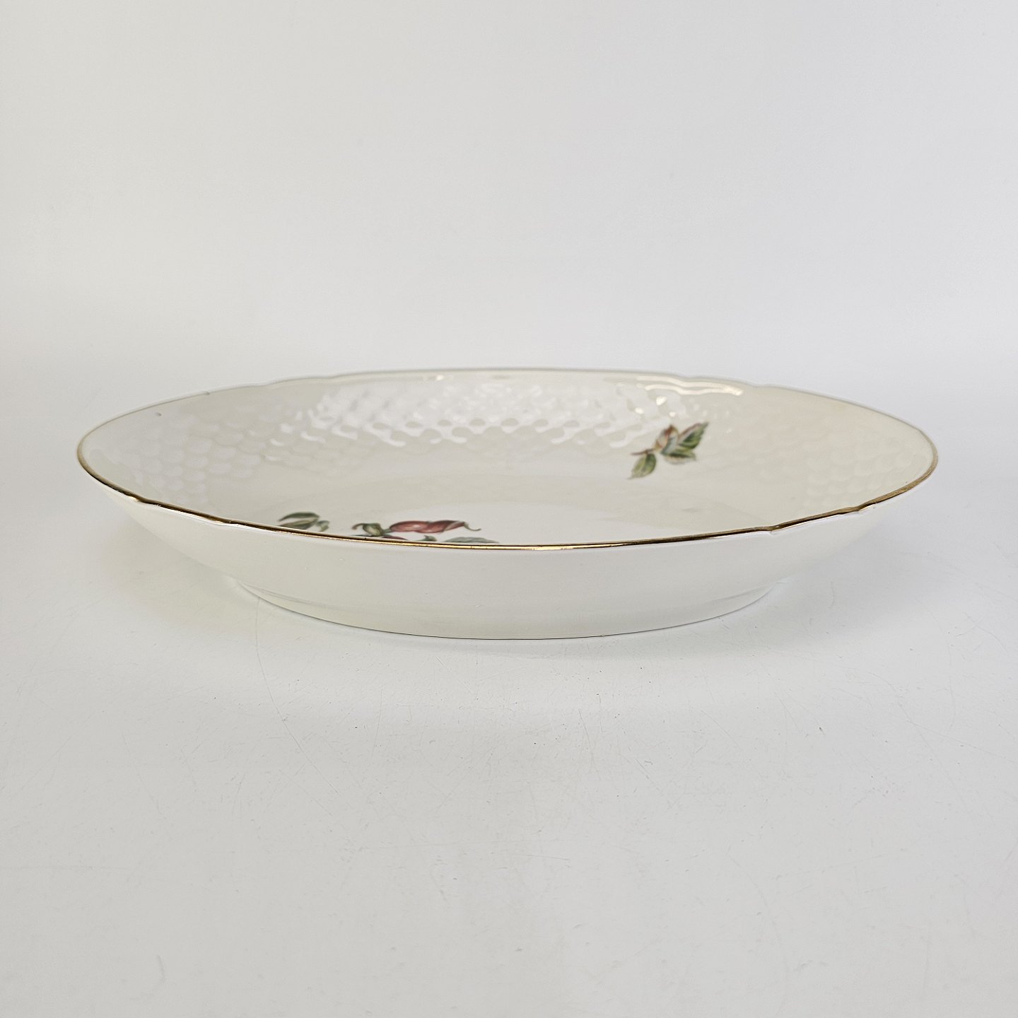 Balder er cremefarvet porcelæn i skælform, dekoreret med hyben og guldkant.
