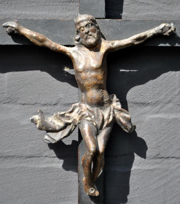 Antique crucifix, 19th century. Christ figure in bronzed pewter. On black-painted wooden cross. 39 x 32 cm.Item number: 28088