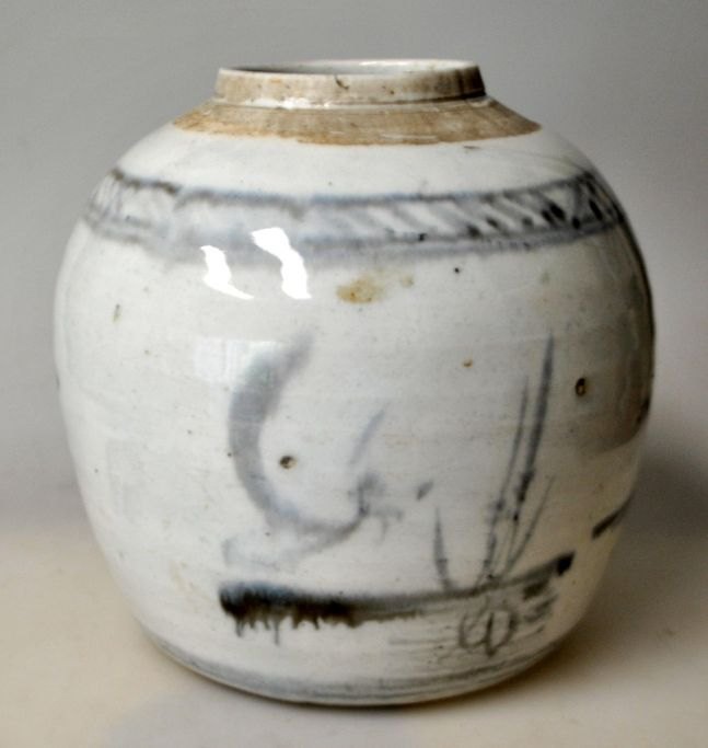 Chinese bojan, 19th century. Gray porcelain with blue/gray paint. Decorations in the form of landscapes. Without lid. Stamped. H.: 15.5 cm. Dia.: 15.5 cm.NB: Small hairline crack at edge.