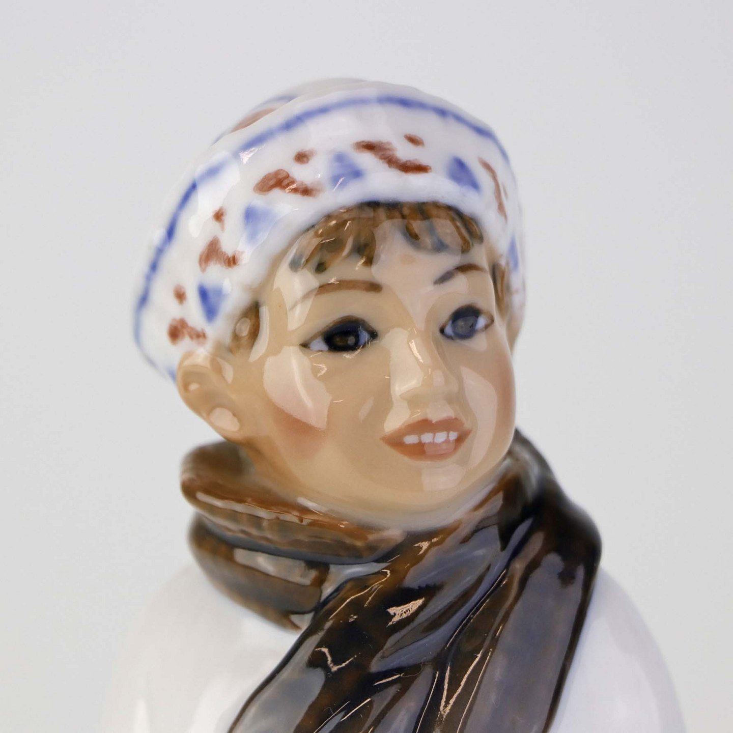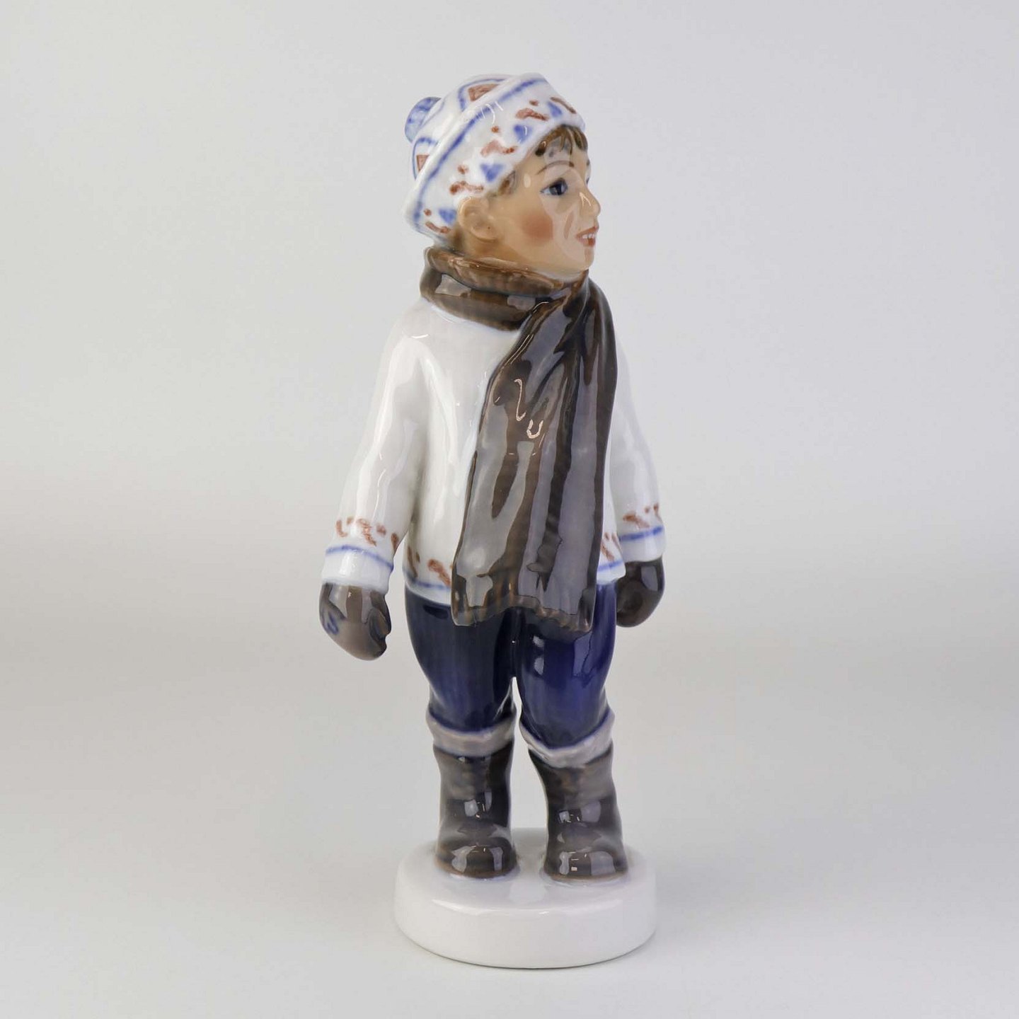 Figur i porcelæn med titlen dreng med halstørklæde. Nr. 1064Producent Jens Peter Dahl-Jensen (1874-1960)