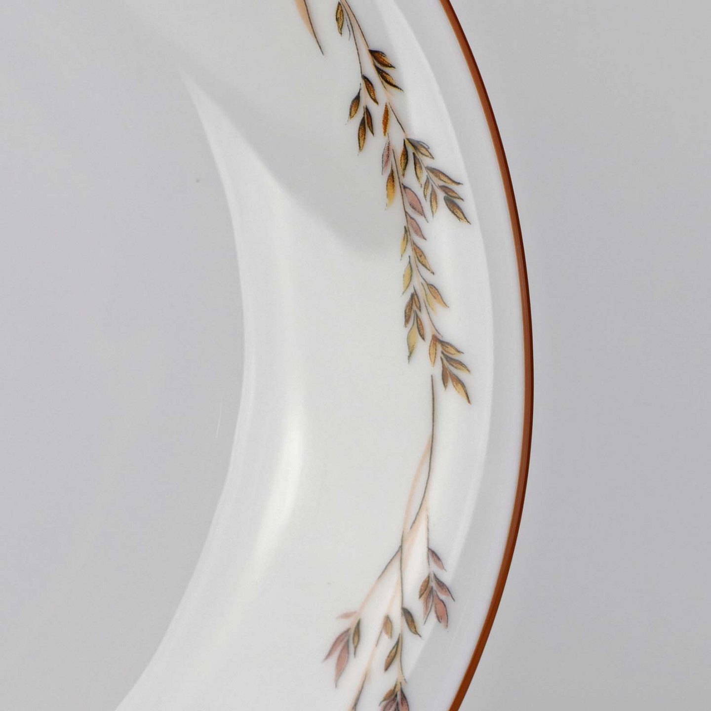 Jagtstellet er i glat hvidt porcelæn med gyldenbrun kantdekoration og motiver af forskellige vilde danske dyr i deres naturlige miljø. Stellet er holdt i dæmpede varme efterårsfarver.