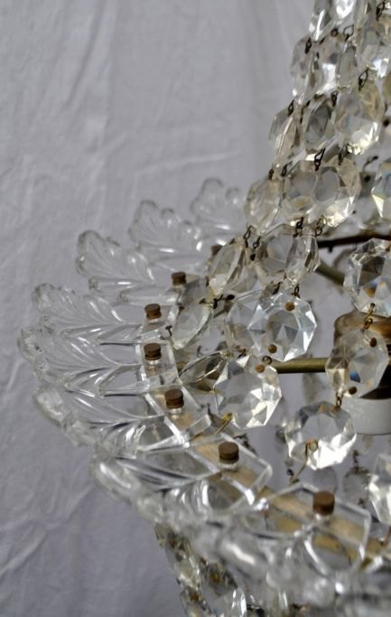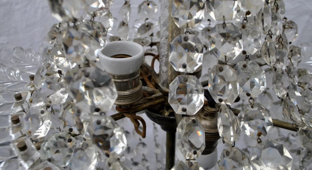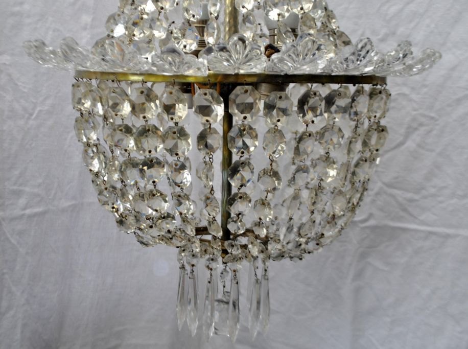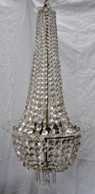 Antique prism chandelier. L: 94 cm. Dia: 46 cm. With 995 prisms and glass top and glass rod. For five light bulbs in porcelain sockets.