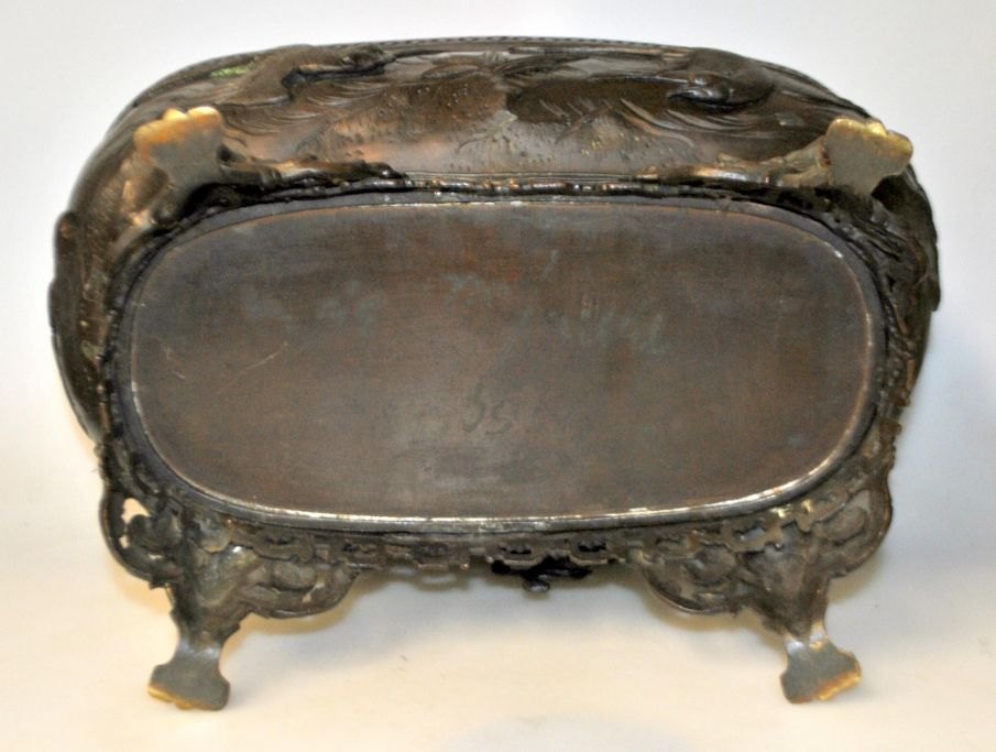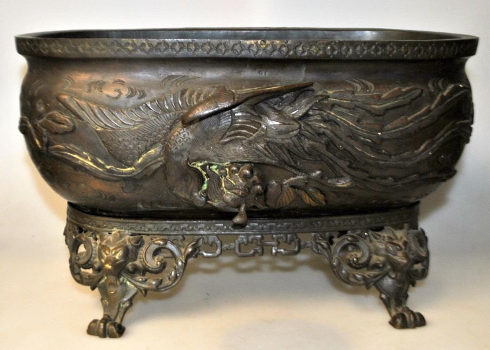 Large Chinese bronze flower jardiniere, 19th century. On four lion feet. With edge decorations. Sides decorated with large dragon and birds. L.: 32 cm. W.: 19 cm. H: 18 cm.Perfect condition!