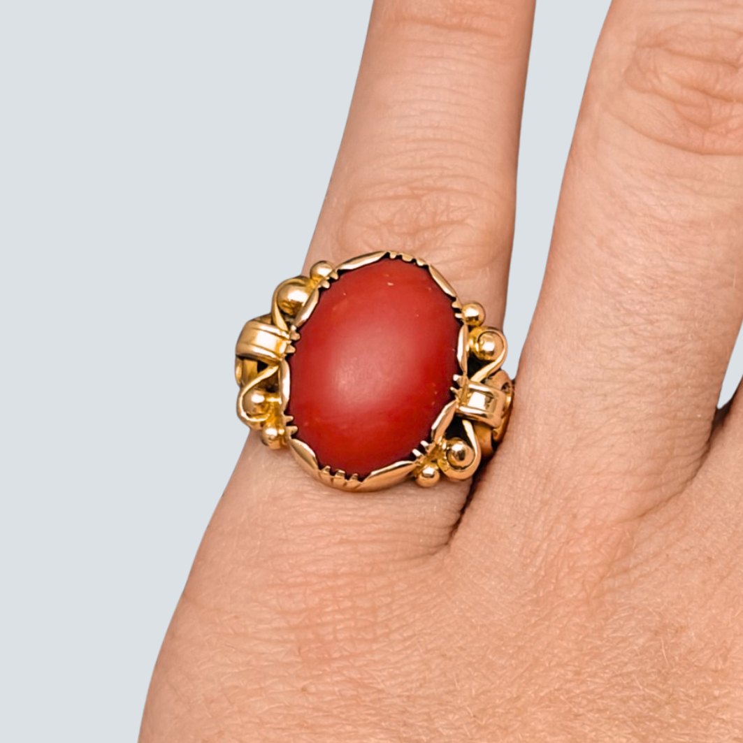 A ring in 14k gold from around 1920. Set with a coral.Ring size 49.