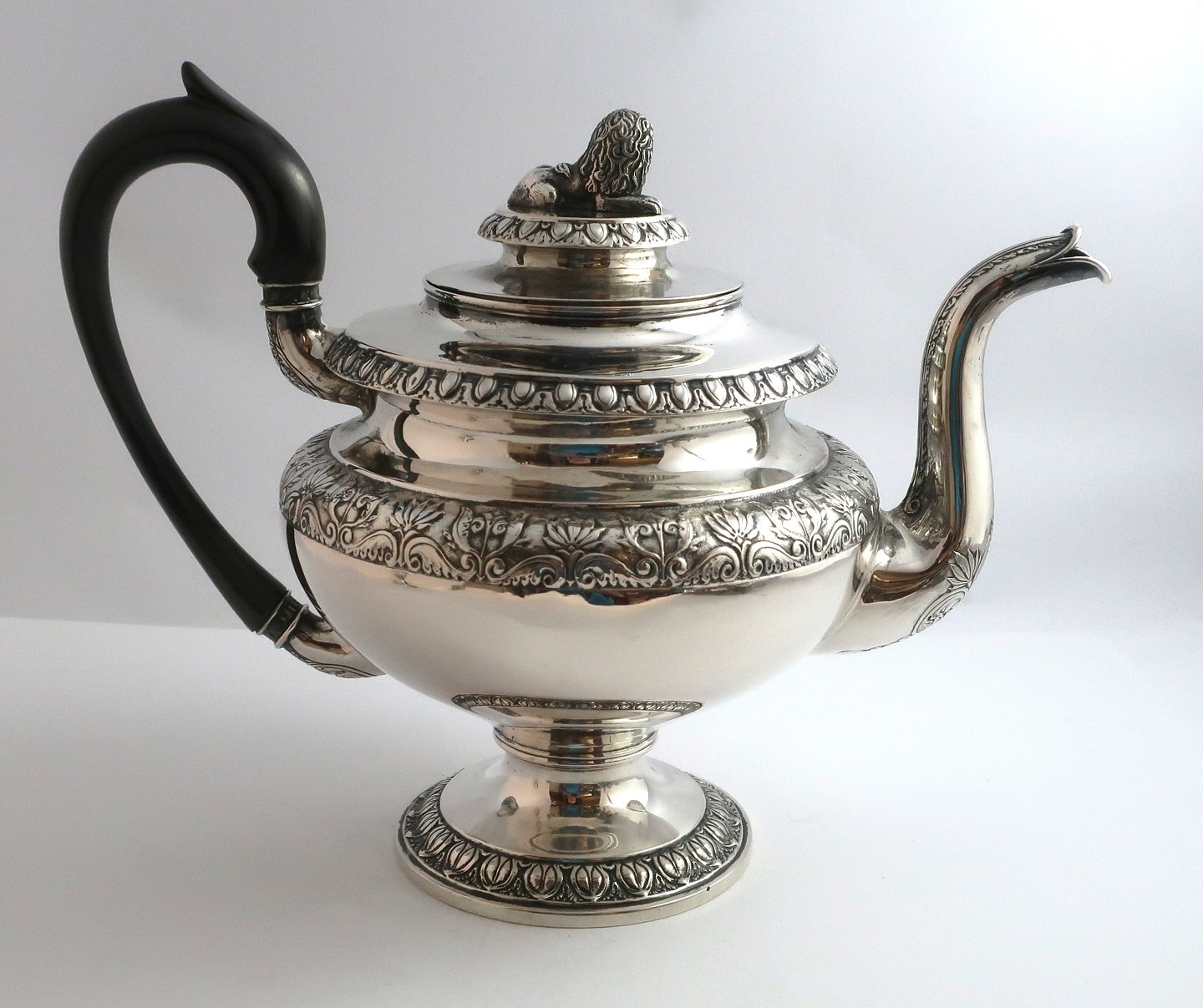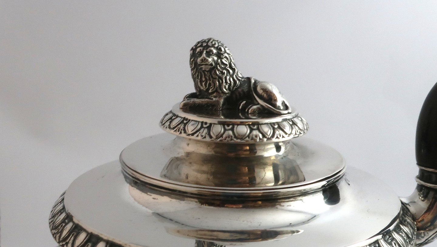 Levin Dyrkopf, Copenhagen (1790-1843). Silver teapot (830). Decorated with a reclining lion on top. Height 21 cm. Produced 1835. Dealer
