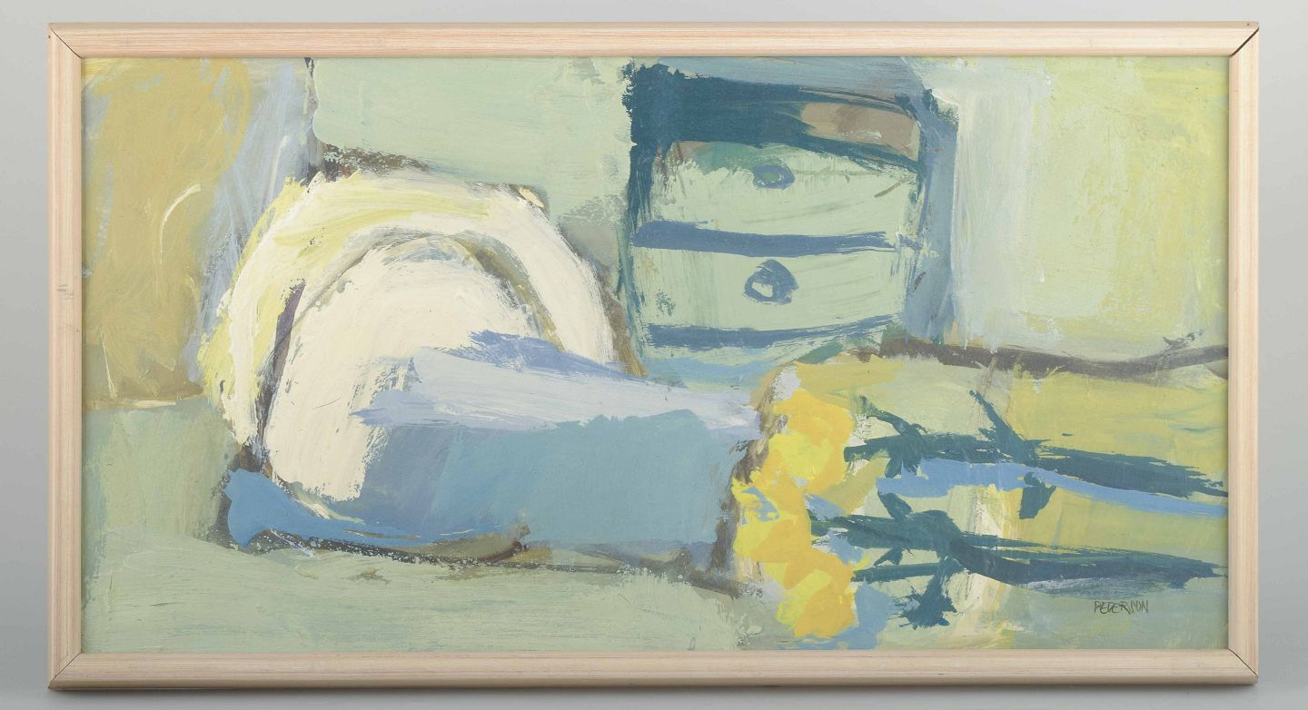 Et stemningsfuldt abstrakt stilleben, hvor geometriske og bløde former i blå, grønne og gule nuancer skaber en harmonisk og lyrisk komposition. Motivet antyder et interiør med blomster og genstande, fortolket i en løs og ekspressiv penselføring typisk for perioden.