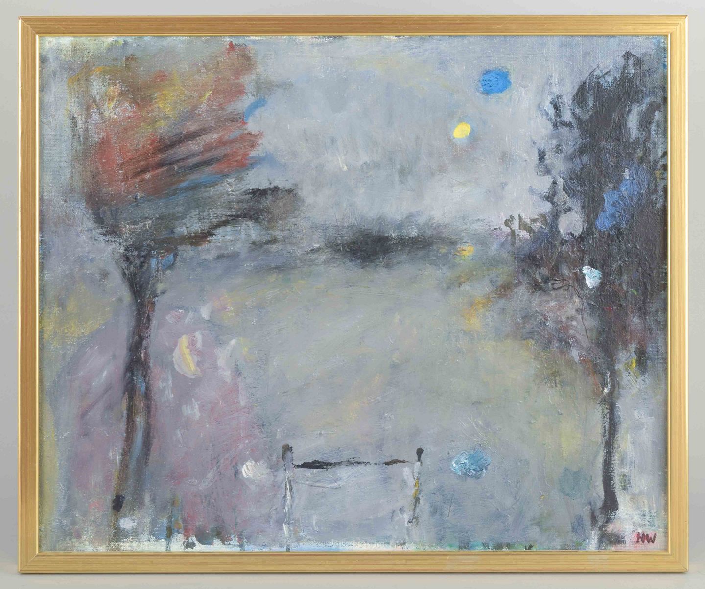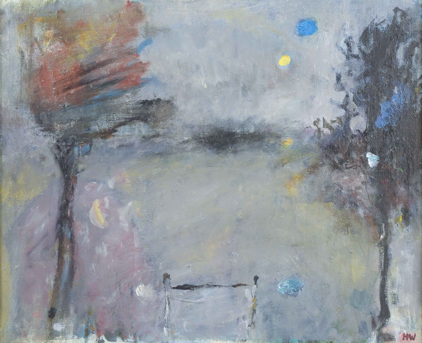 An atmospheric abstract painting with suggestive features, where a gate in the foreground opens onto a misty landscape. The color palette is dominated by subdued shades of grey, blue, and violet, accented with touches of yellow and red, giving the composition a dreamlike and poetic quality.