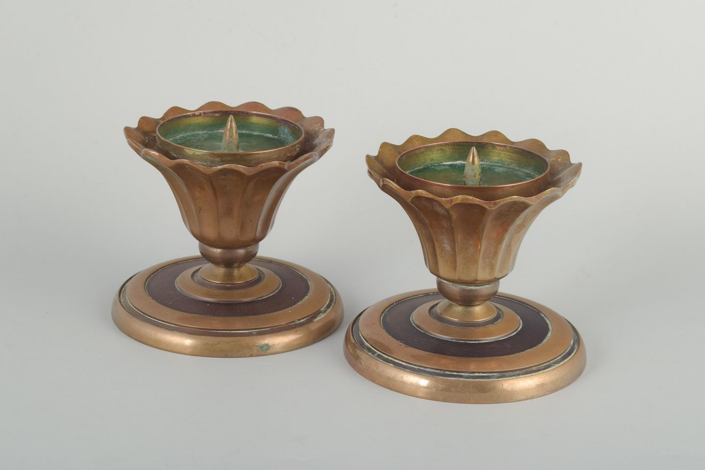 Solid brass candlesticks with circular base and geometric ring decorations, typical of the period.