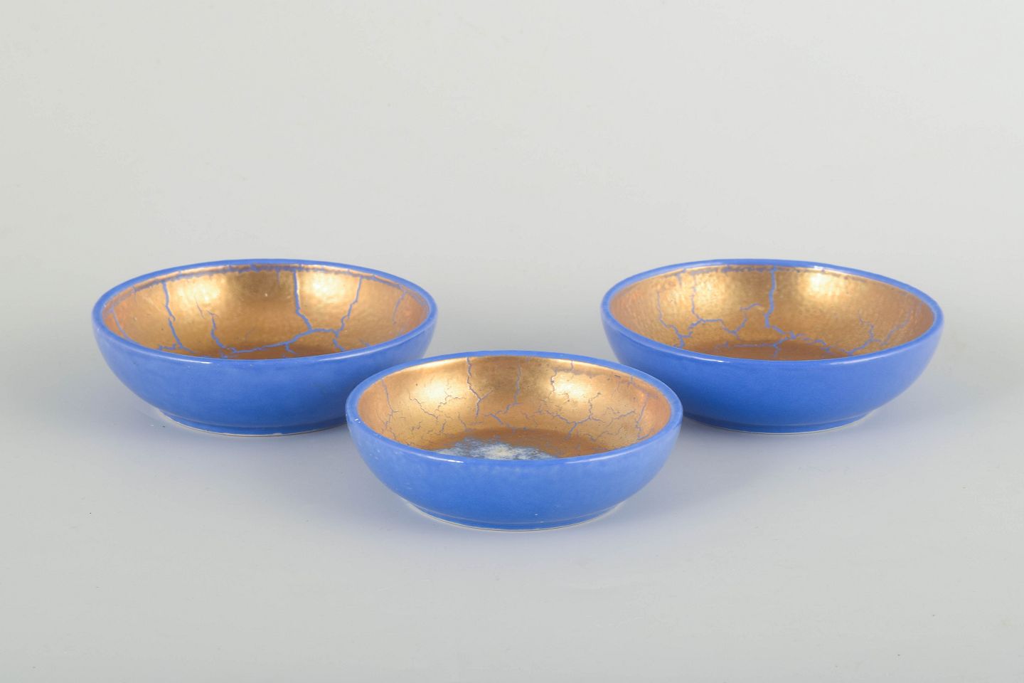 Set of three low faience bowls with blue exterior glaze and metallic gold interior glaze with craquelure.