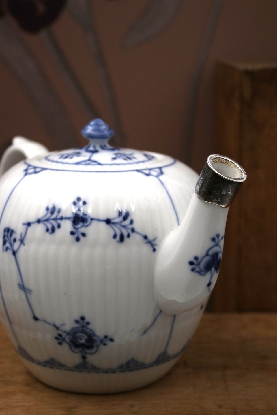 Old teapot in Blue Fluted, Plain from Royal Copenhagen from 1898-1923. Decoration number: 1/250. 1.sort. H: 12cm.The pot has old silver mounting / repair on the pouring spout. Otherwise in good condition.
