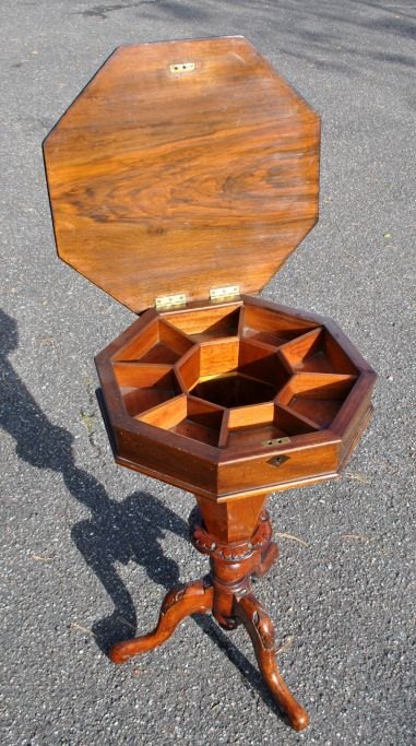 8 kantet sybord i valnøddetræ med intarsia, 19. årh. Danmark. På udskåret trefod. 8 kantet søjle til garnopbevaring. 8 kantet top i mahogni med bordplade i valnødderod. Indvendig med 8 rum. Med nøgle og lås. Plade dekoreret med indtarisa i stjernemønster. Sortindfarvede kanter. Oppoleret. H.: 72 cm. Dia.. plade: 42 cm.Flot, flot stand!