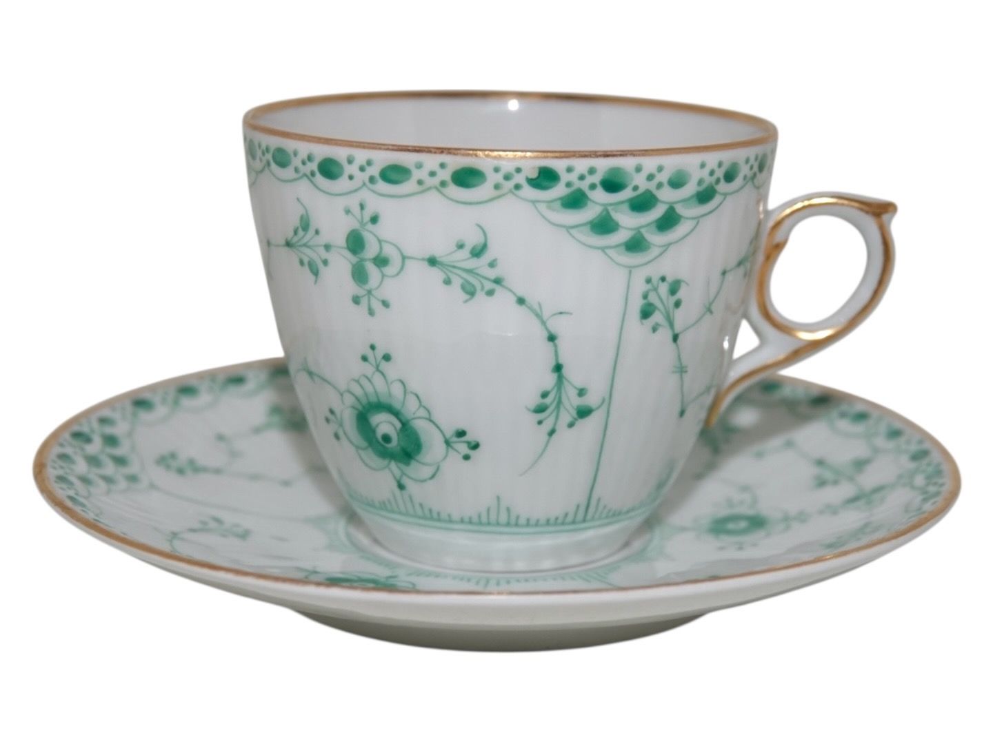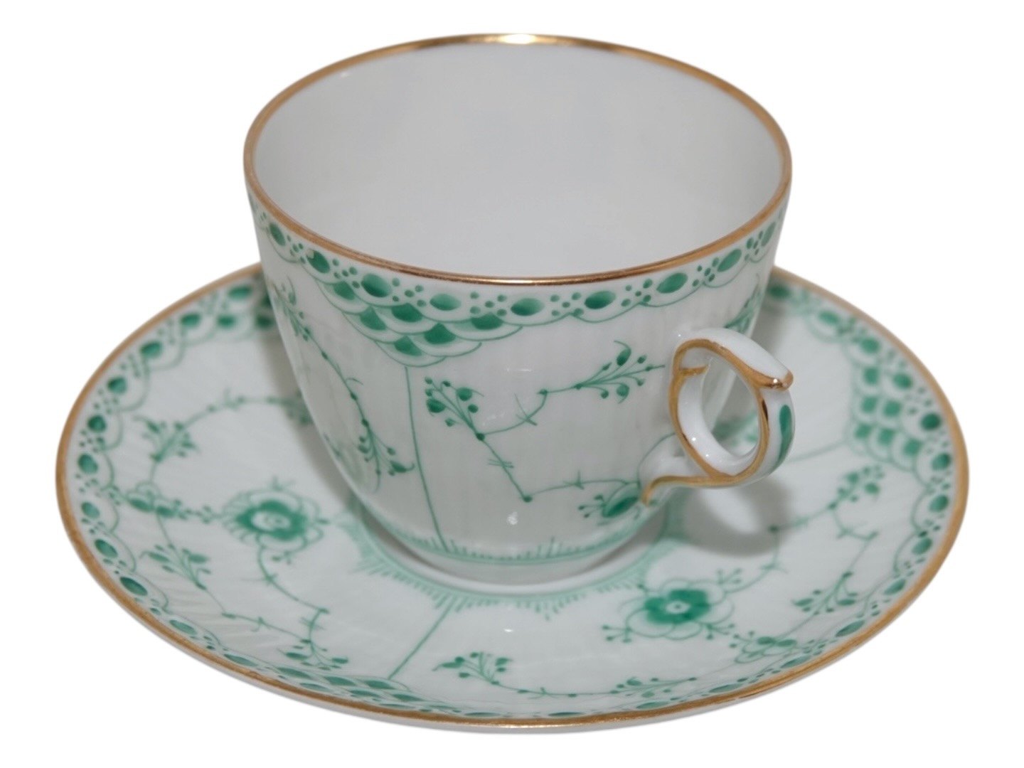 Royal Copenhagen Grøn Musselmalet Halvblonde med guldkant, lille kaffekop med tilhørende underkop.Det er sjældent at finde det helt tidlige grønne Musselmalet porcelæn.