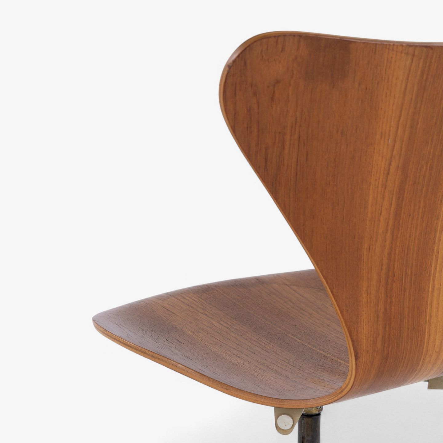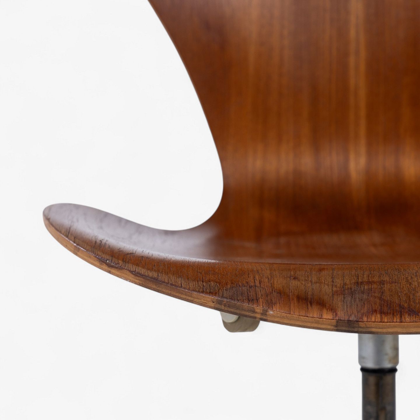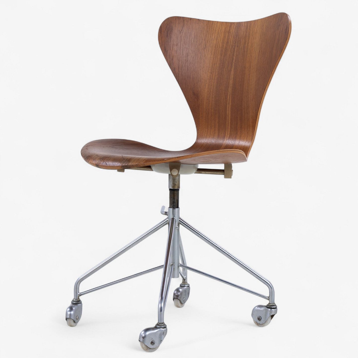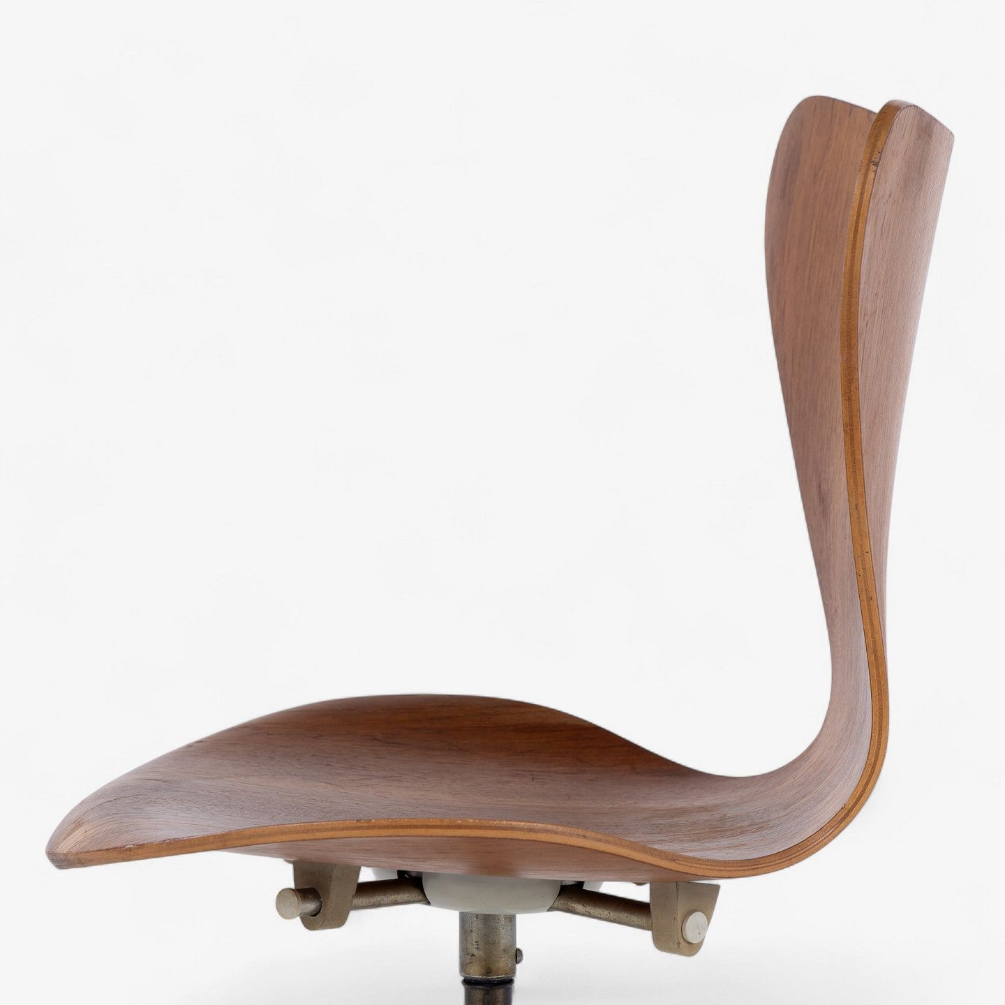 AJ 3117 - 'Seven' office chair in patinated teak on an old frame with height adjustment. Manufacturer's stamp.