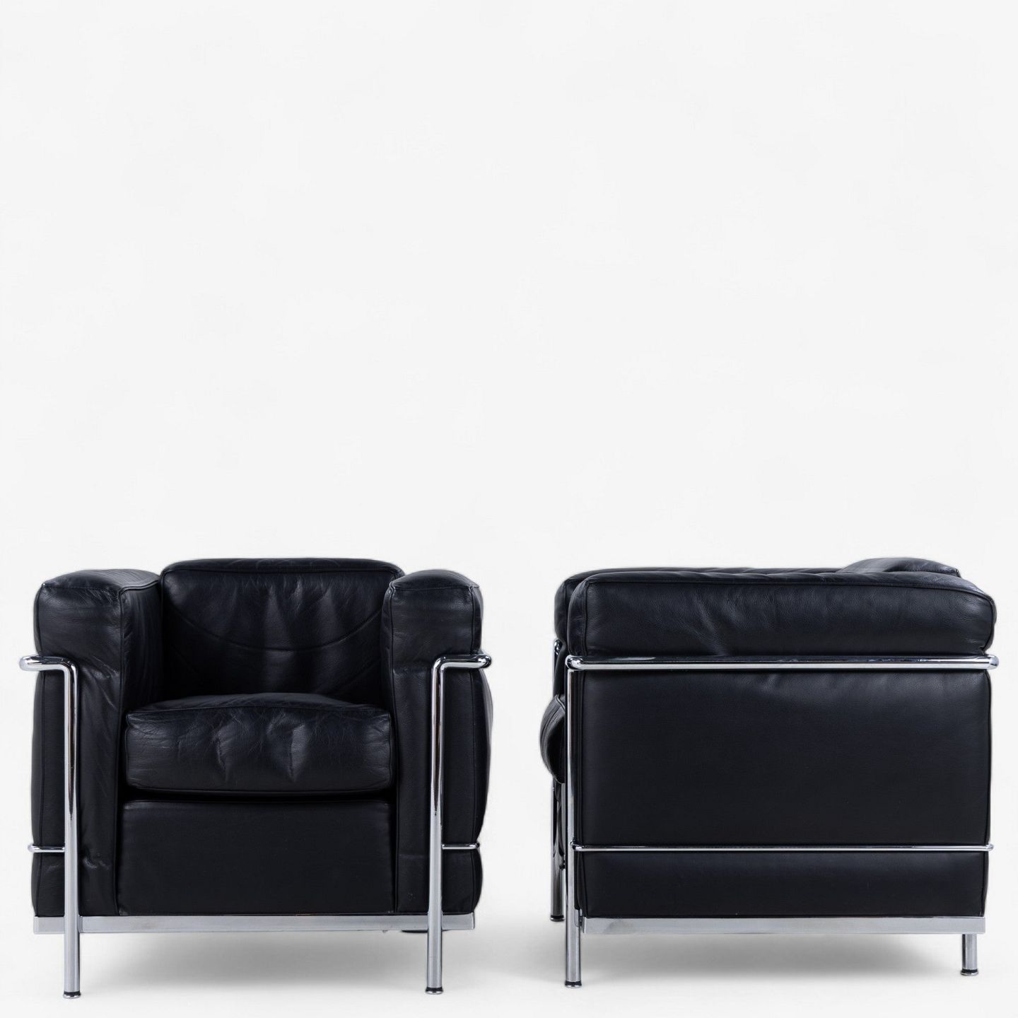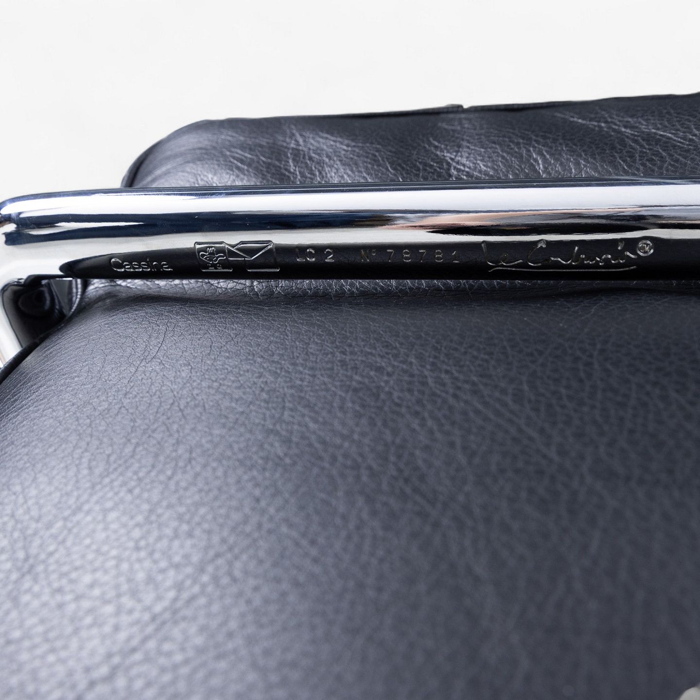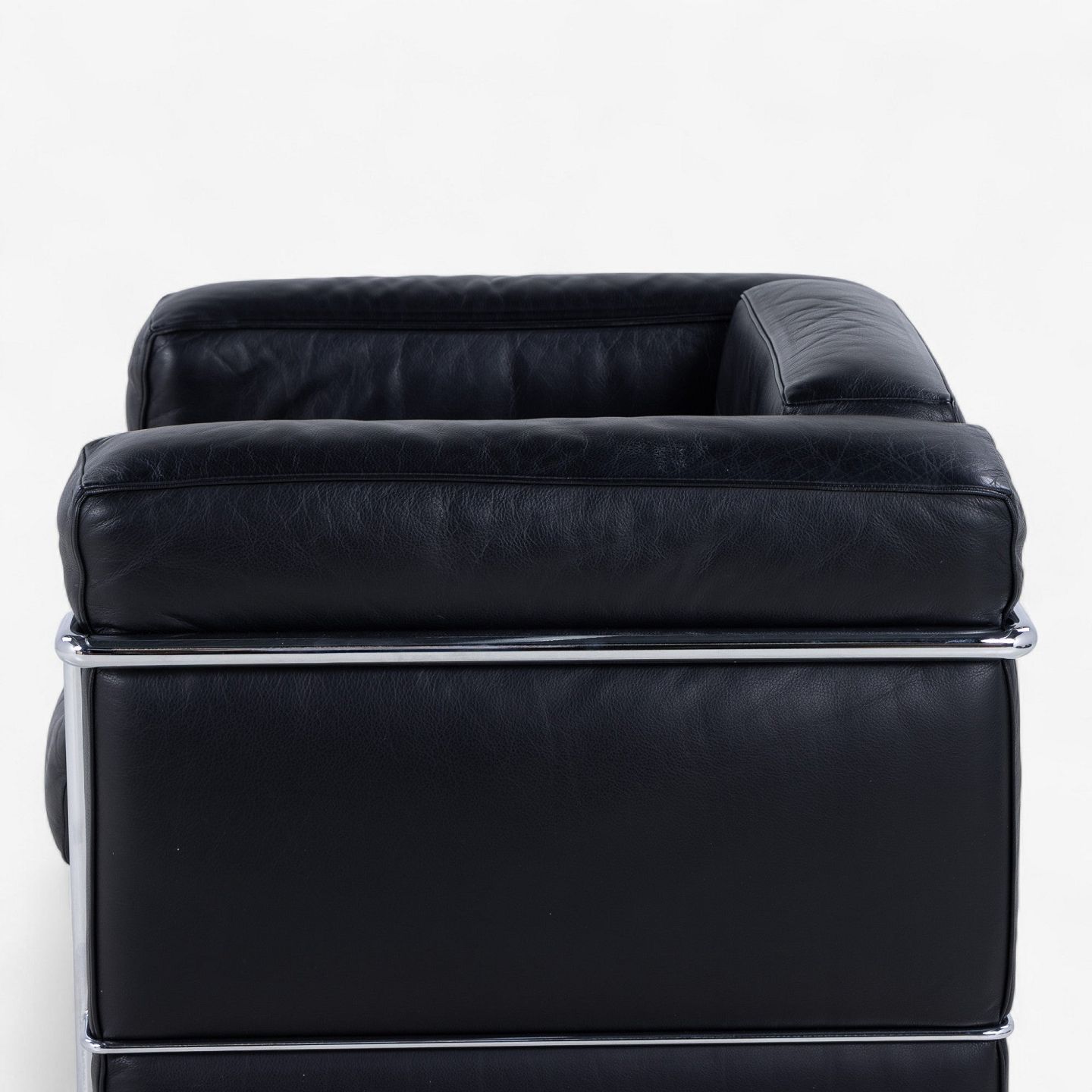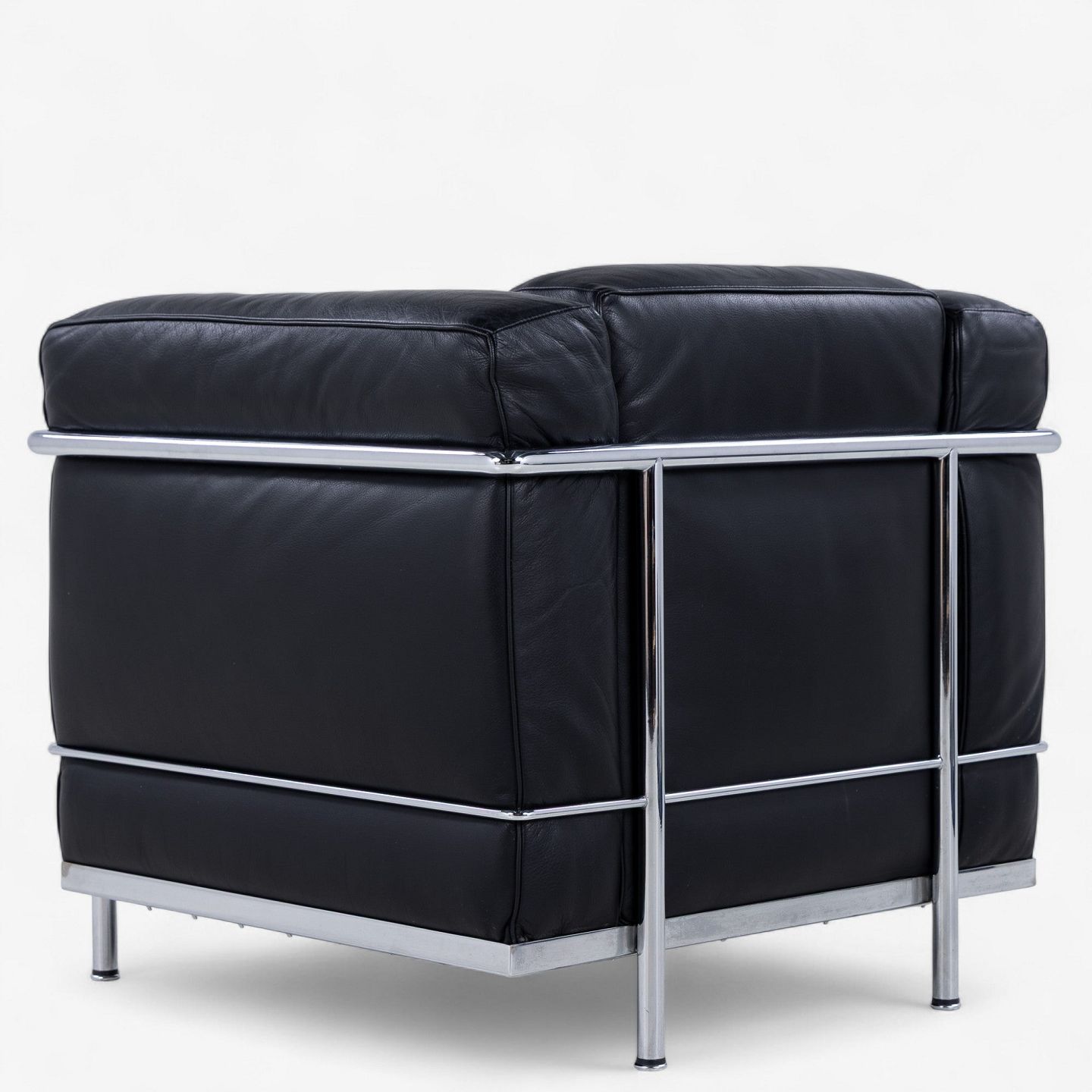 LC 2 - Lænestol i originalt sort læder med stel i stål. Stemplet fra producent.