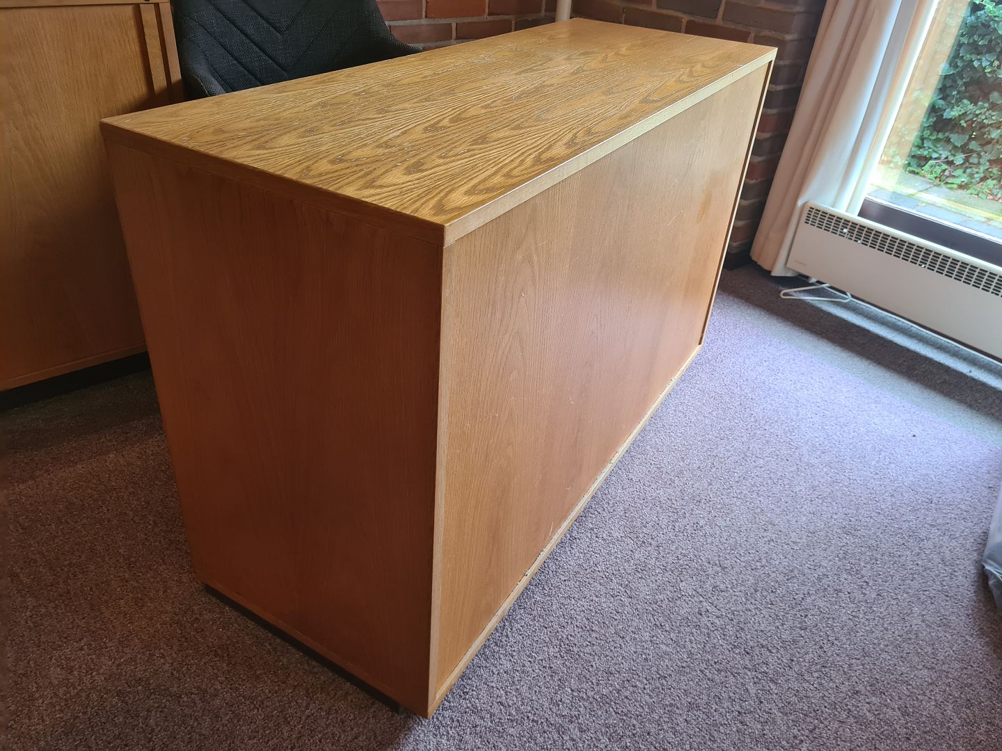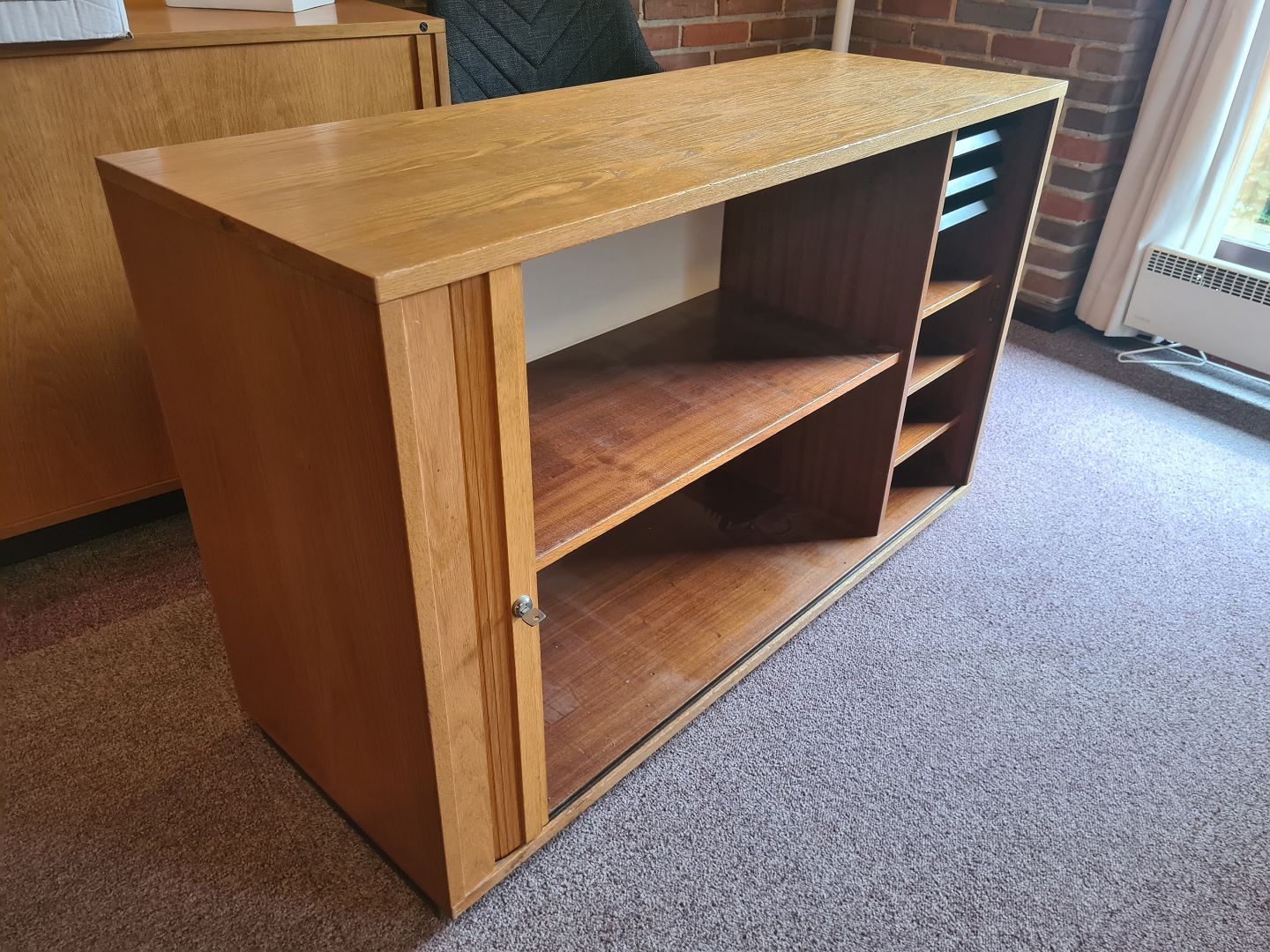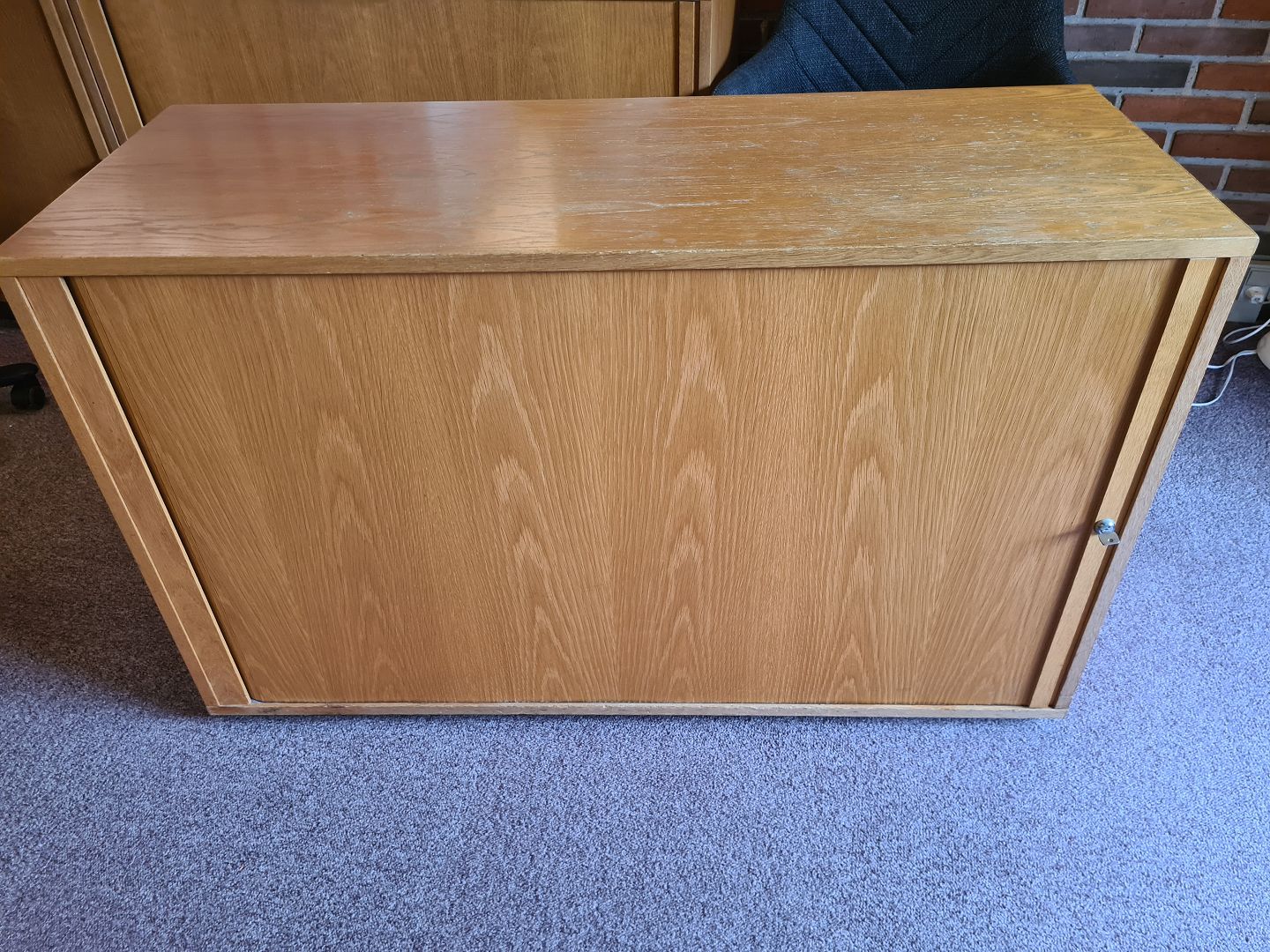 Arkivskab fra 1980'erne i finéret eg med jalousi låge. Fremstår pænt og velholdt, dog med lettere brugsspor på toppen. (Billeder) Forskellige indretningsformer haves. Fungerende nøgle medfølger.Højde 74 cm. Bredde 120 cm. Dybde 45 cm.