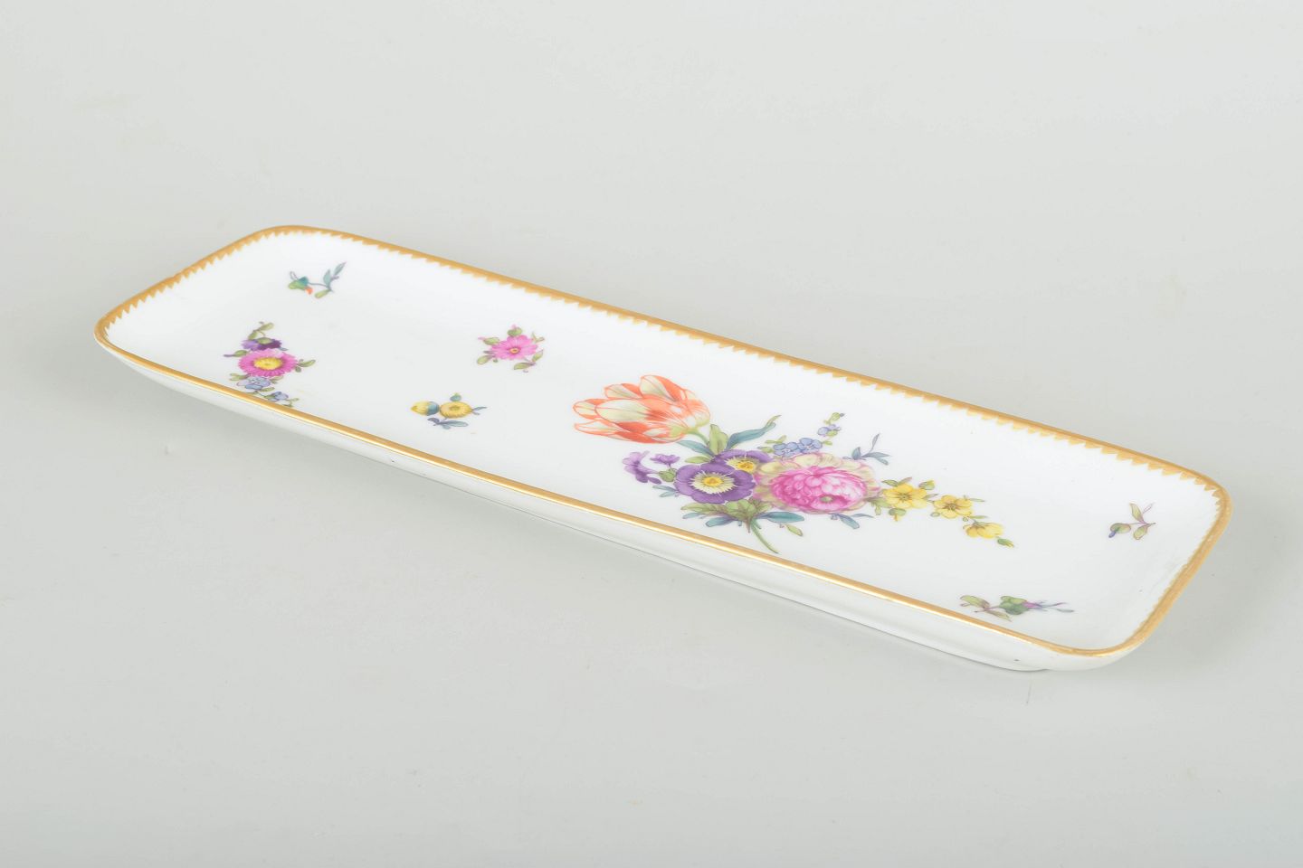 Antique rectangular porcelain pen tray decorated with hand-painted flowers in the classic “Saxon Flower” pattern and gilded rim.