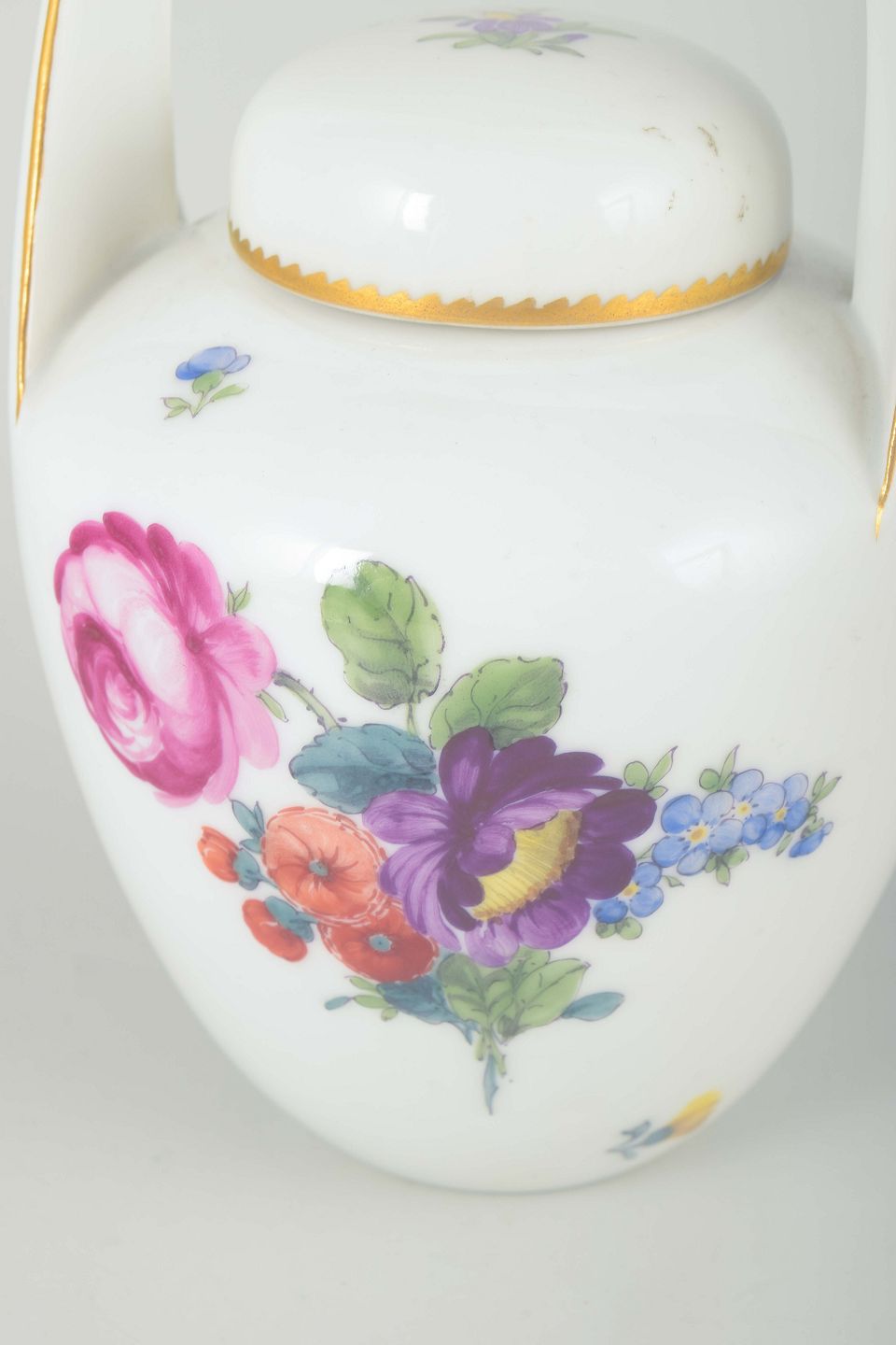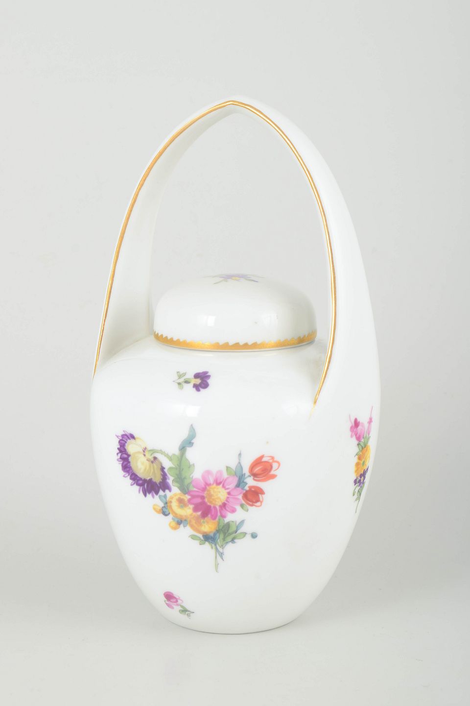 Antique porcelain lidded vase with elegant arched handle, decorated with hand-painted flowers in the classic “Saxon Flower” pattern and gilded rim.