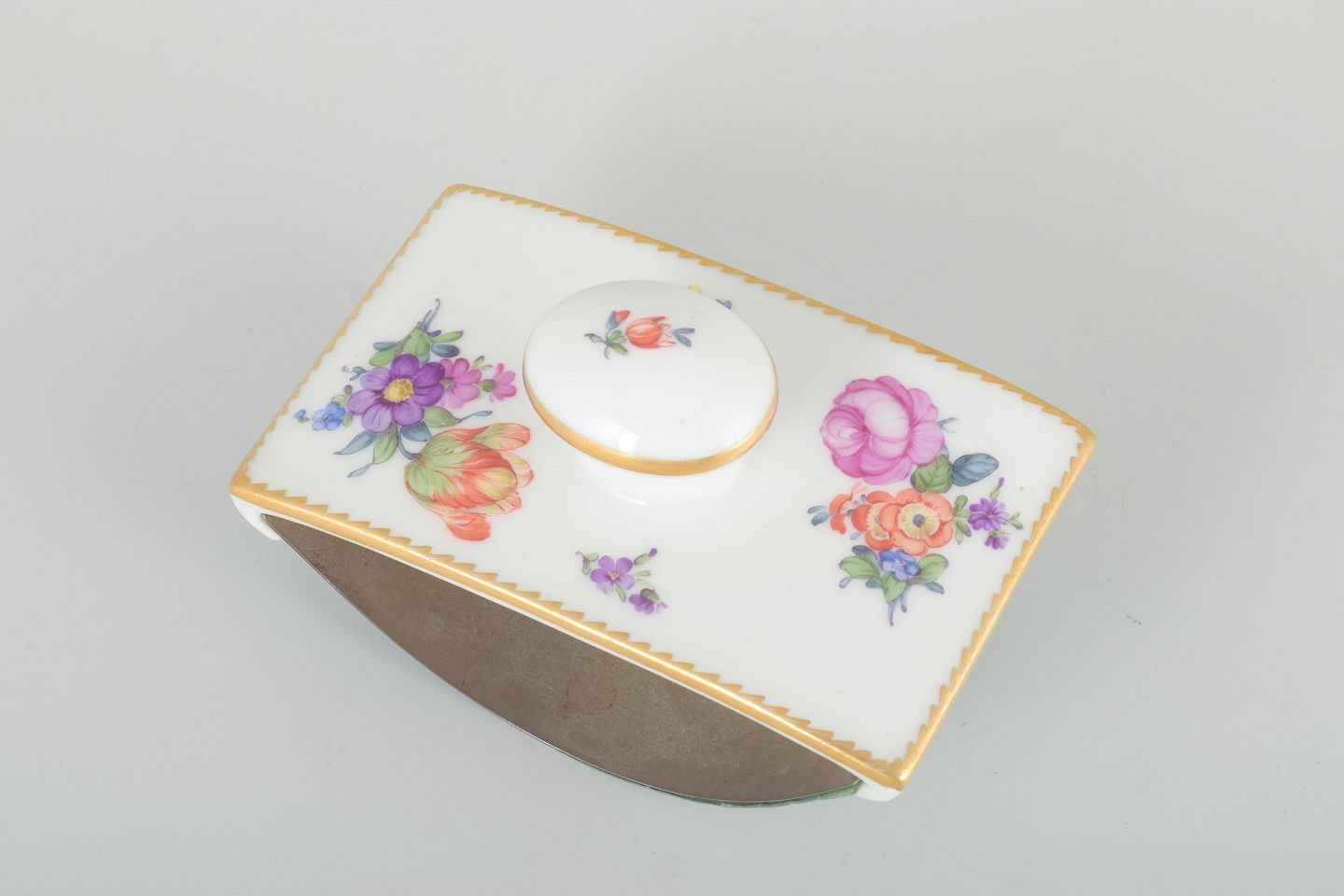 Royal Copenhagen Saxon Flower ink blotter, c. 1900.Porcelain blotter decorated with hand-painted flowers in the classic “Saxon Flower” pattern, gilded rim, and knob-shaped handle.