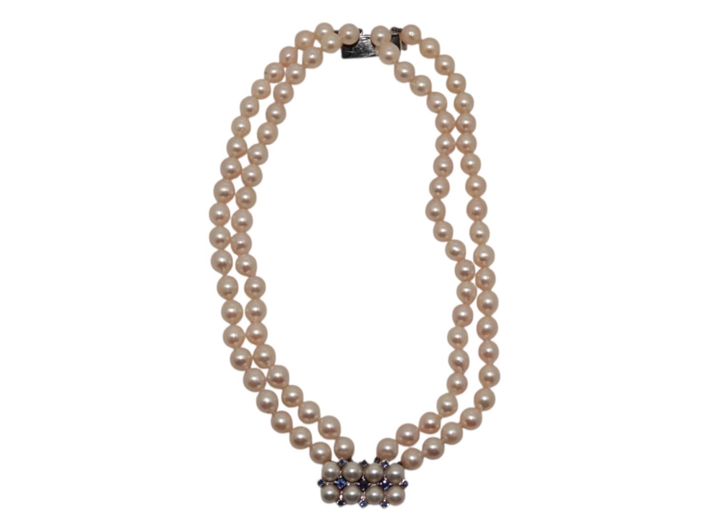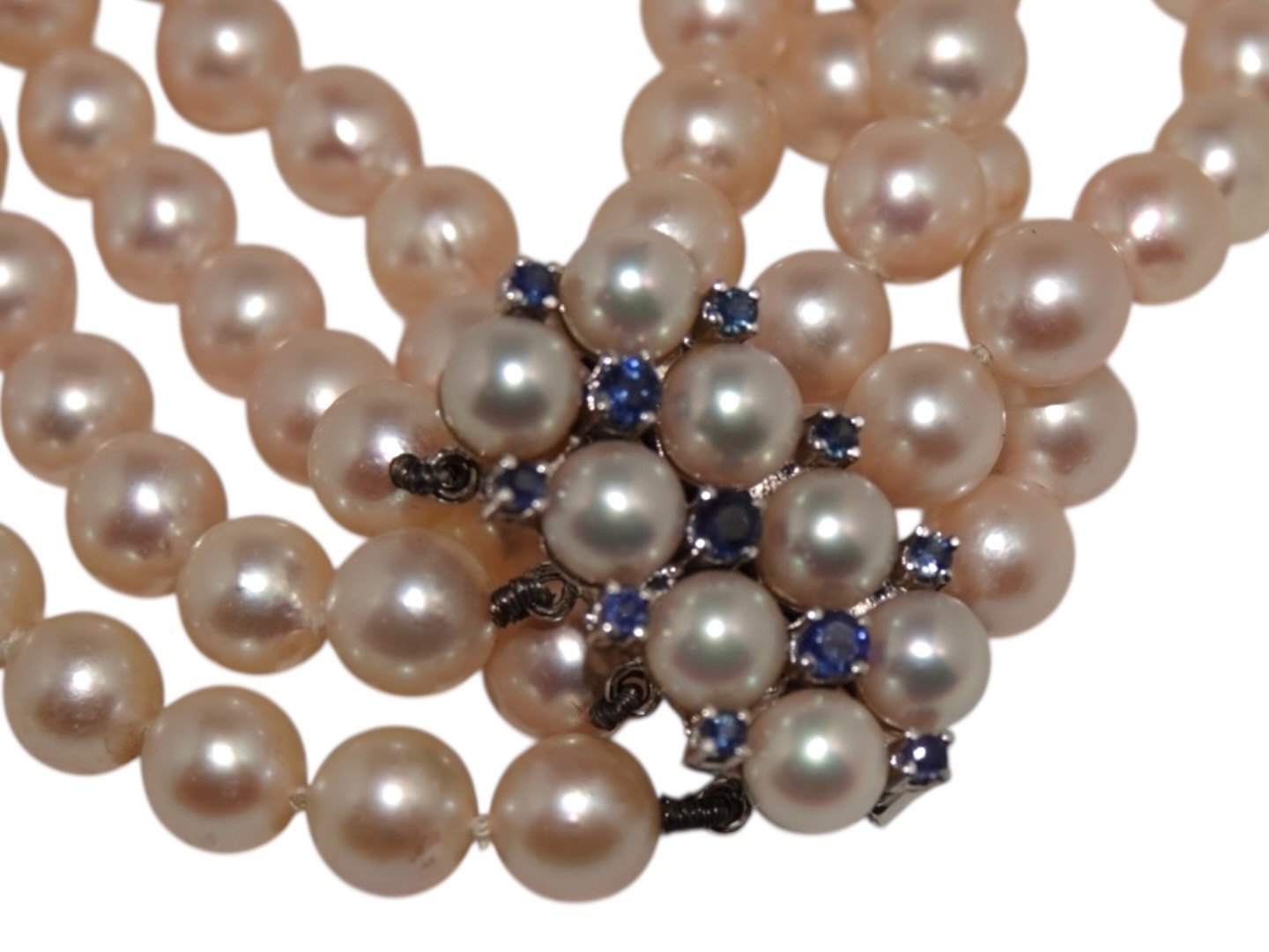 Double row pink Akoya pearl bracelet with 14 carat white gold pendant with sapphires.Akoya pears are some of the best pearls in the world, due to a high quality, a more round shape and a great shine and the pink color is the most sought after.