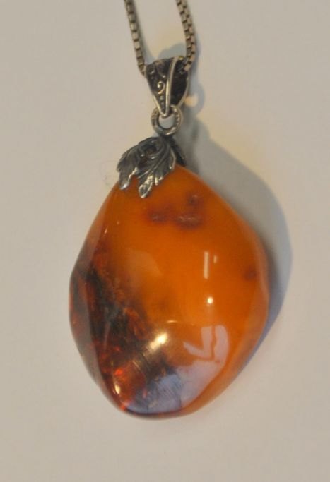 Amber necklace, N.E From, Nakskov (after 1944), Denmark. Polished amber. Sterling silver pendant with foliage and flowers. Sterling chain, length: 42 cm. From GIFA.Item number: 28206