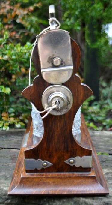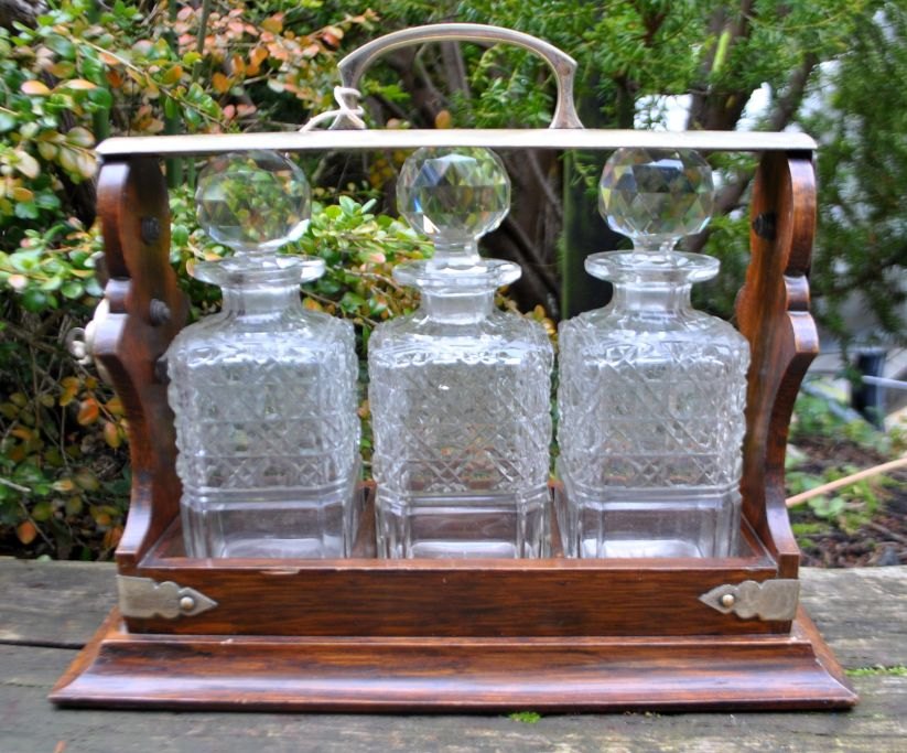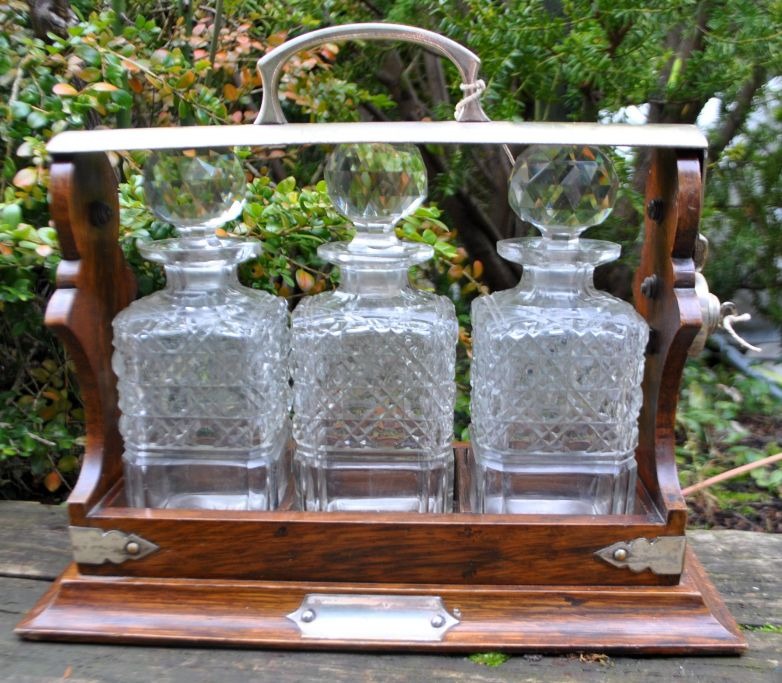Tantalus of oak with three crystal decanters with stoppers. England. 19th century. With brass fittings and handle. Opening in handle with lock and key. L: 37 cm. H: 30 cm.Item number: 28419