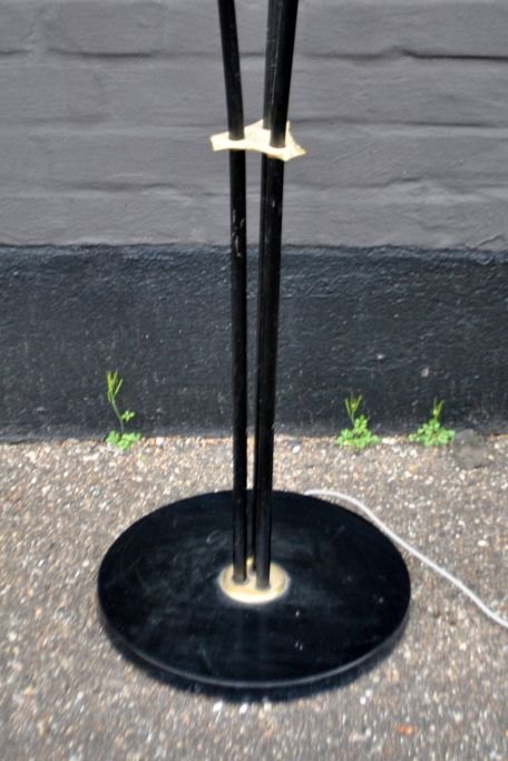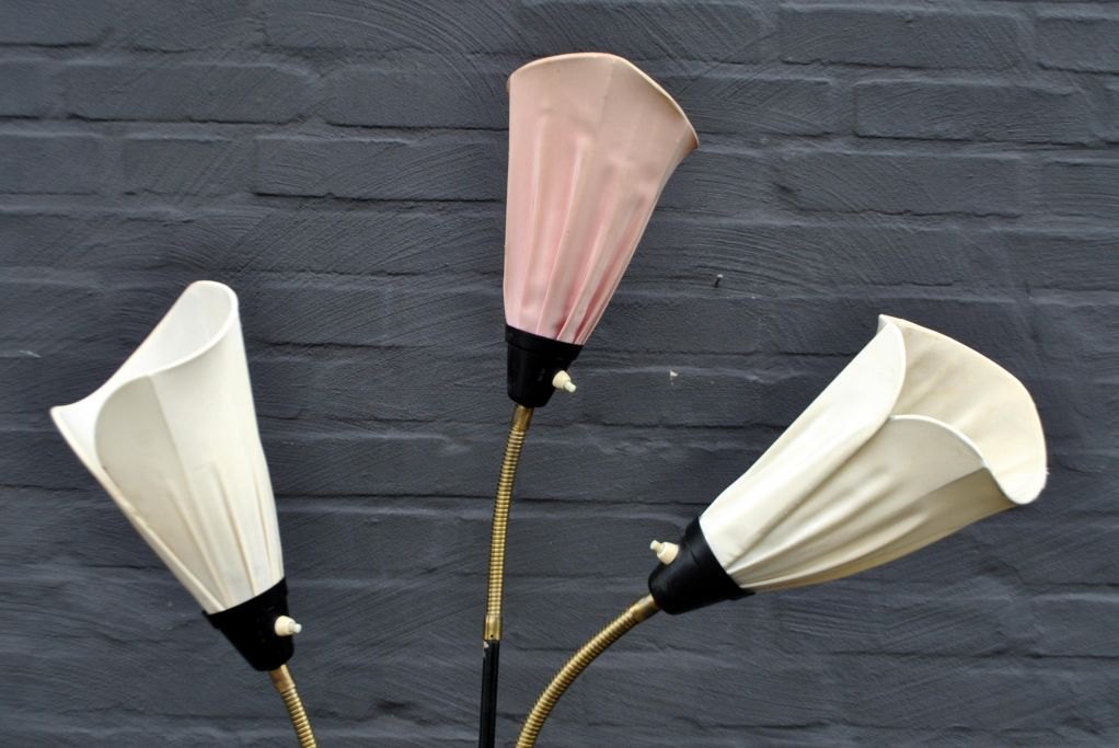 Borëns, Borås floor lamp model 7297, 1950-60s. Sweden. Frame in iron with brass. Lampshades in fabric, two in white, one in pink. H: 180 cm. Dia: 30 cm.Item number: 28421