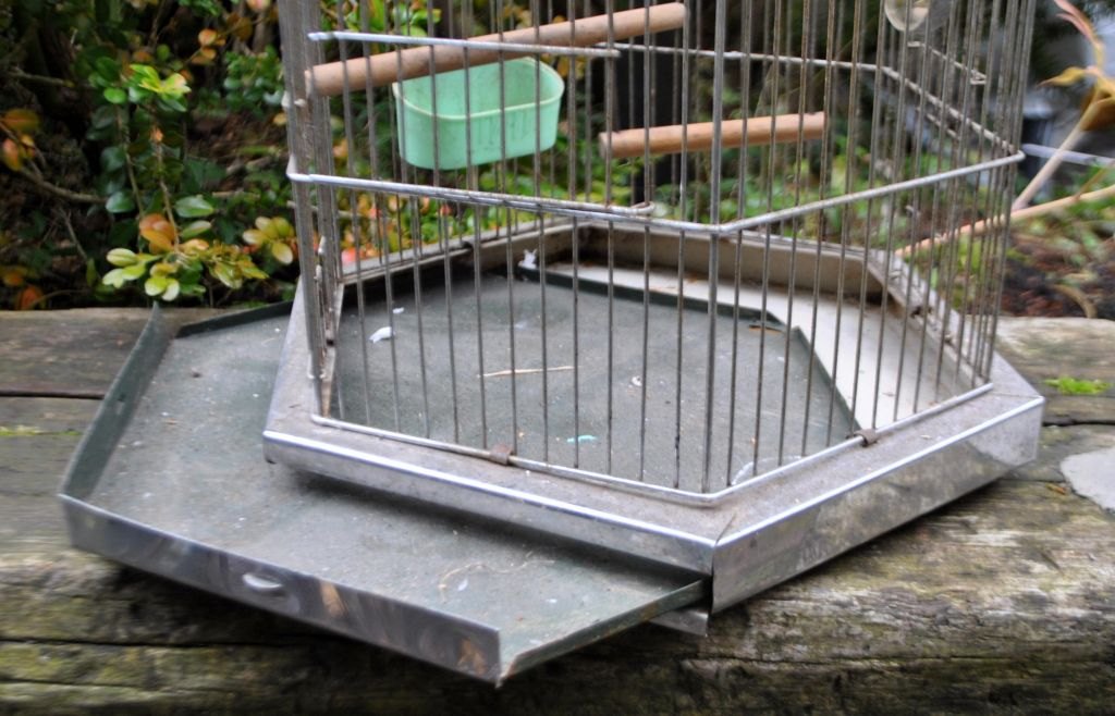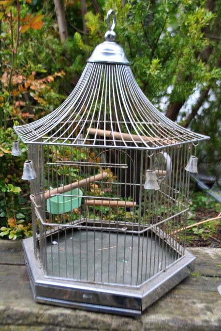 Hexagonal birdcage in metal, 20th century. With a door, two sliding doors, two wooden pegs, mirror, swing and food trough. Bottom can be pulled out as a drawer for cleaning. Incl. hook for hanging. H: 45 cm. W: 34 cm.Item number: 28426