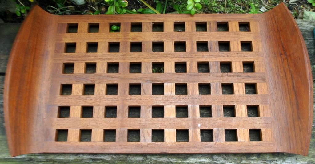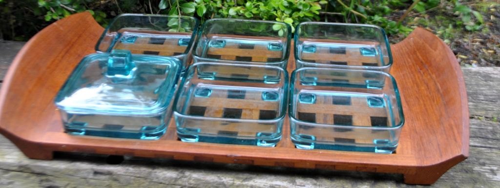 Teak cabaret dish with six glasses, Jens H. Quistgaard. 2nd grade. Stamped JHQ Denmark. One of the glass dishes has a matching lid. L: 45 cm. W: 25.5 cm.Item number: 28427