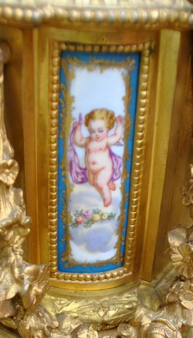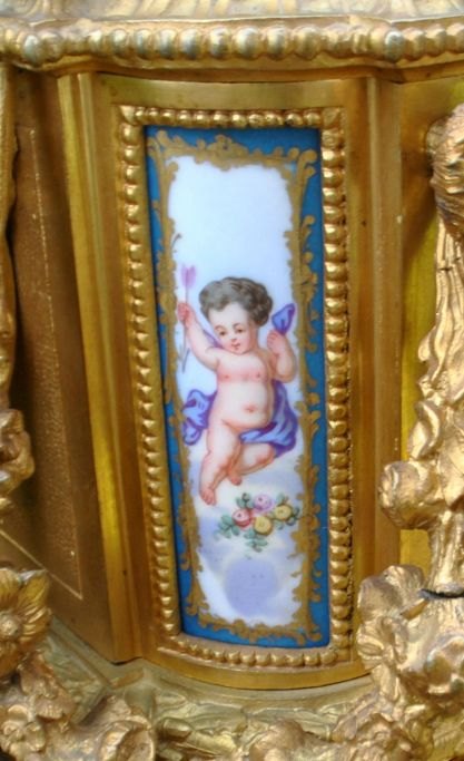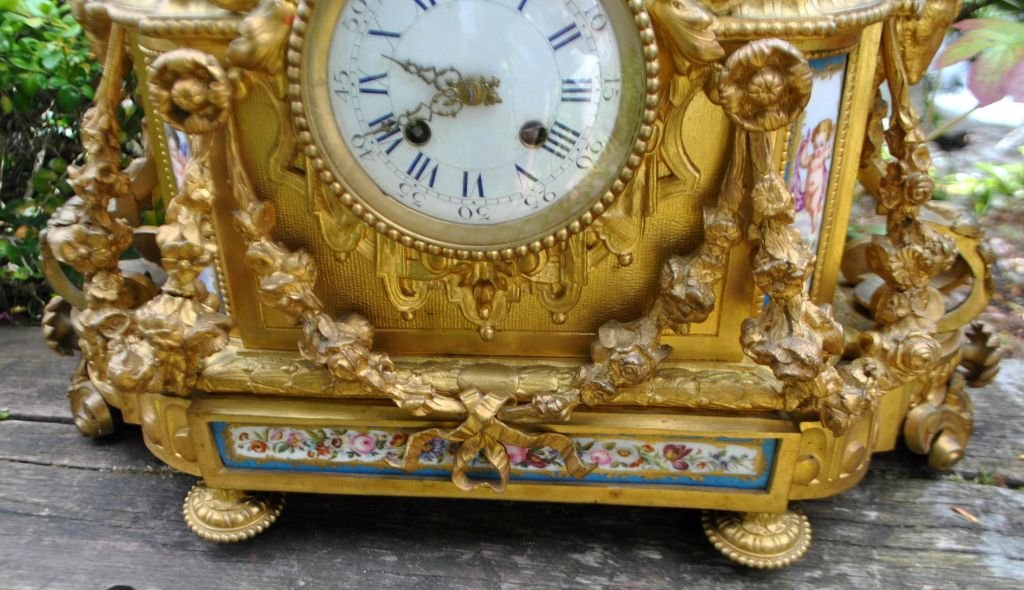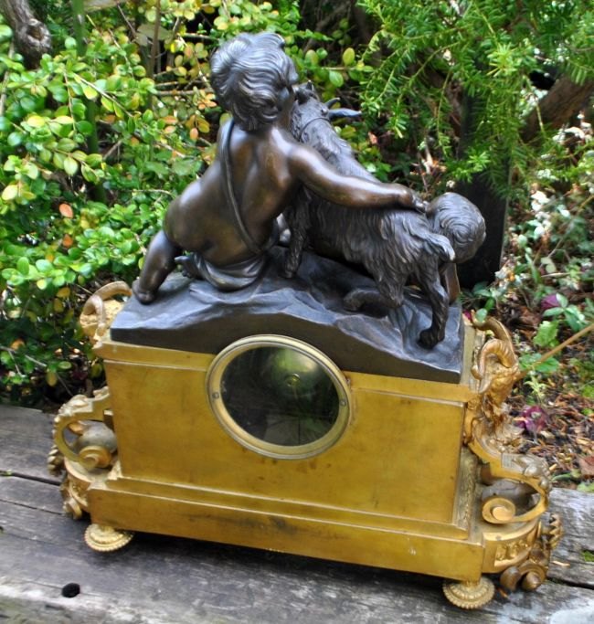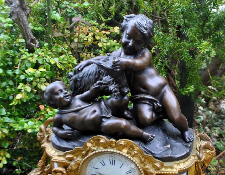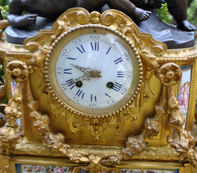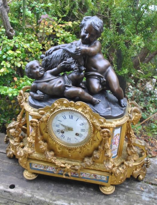 Large French mantel clock in bronze, early 19th century. Top decoration in the form of two putti and a billy goat. Clock case in gilded bronze with garlands and rams' heads. Also porcelain plaques with flowers and putti. White enamel dial with Roman and Arabic numerals. Standard clockwork with cord suspension.Item number: 28431