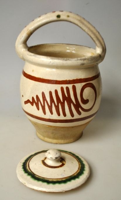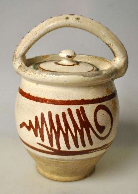 Antique Danish maternity pot in glazed red clay, 19th century. With white underglaze and red and green overglazes. H.: 21 cm.Item number: 28432