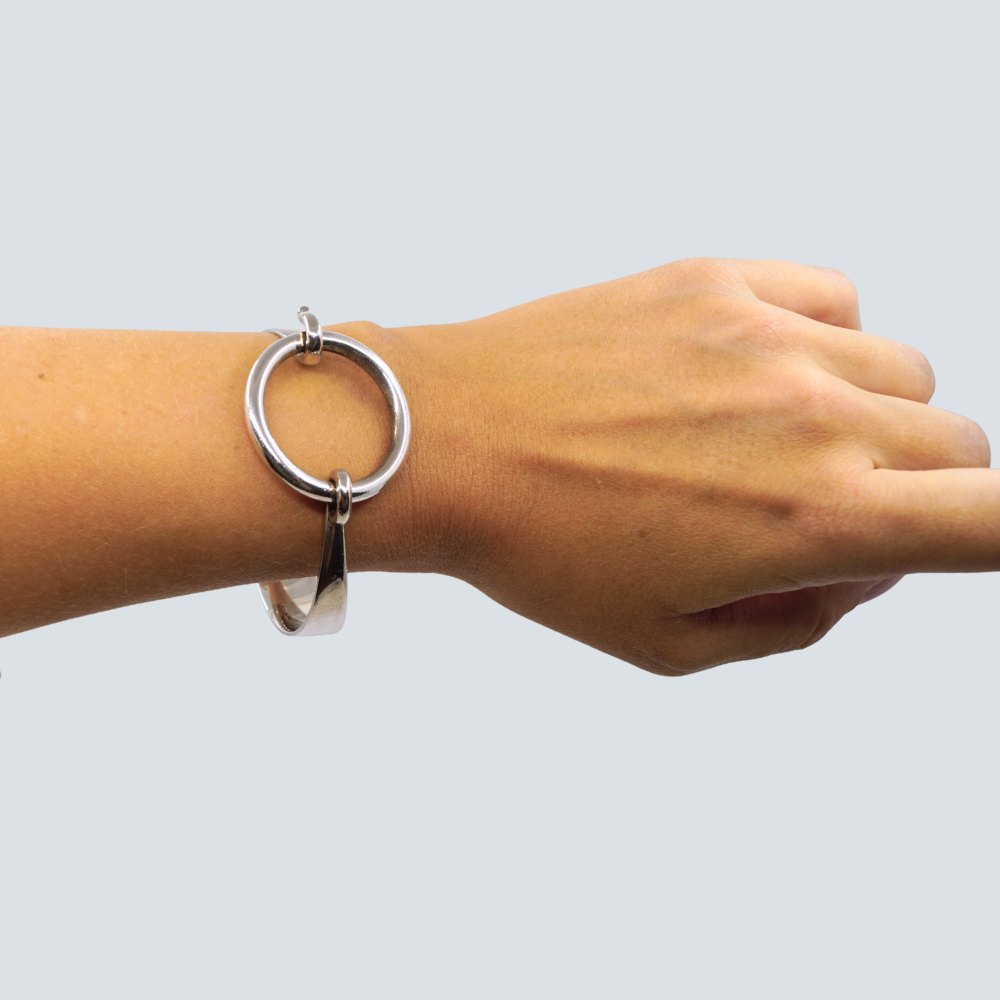 Hans Hansen silver jewellery.Hans Hansen; A brangle made of sterling silver. Front shaped like a cirkel, and can be opened.