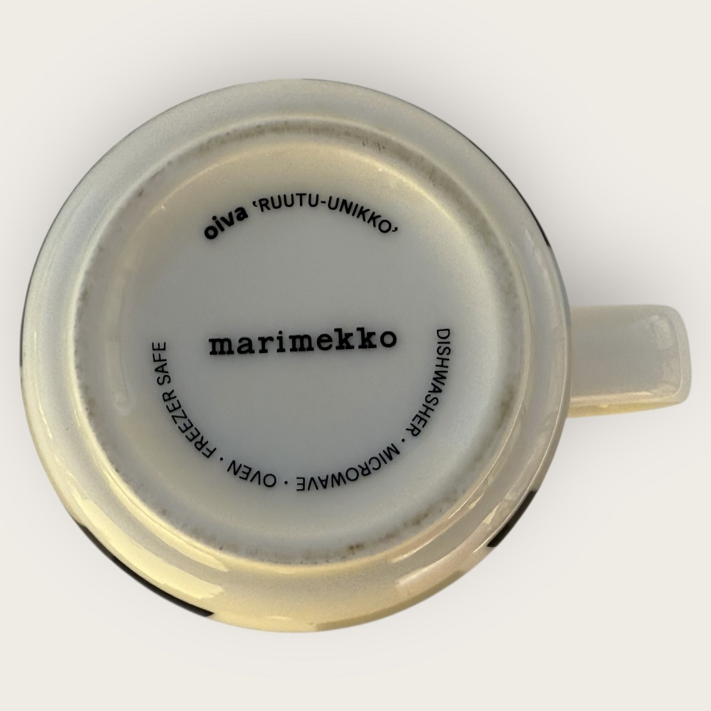 Marimekko mug with stripes, Oiva Ruutu-Unikko, Height 9.5cm, diameter 8cm *perfect condition*