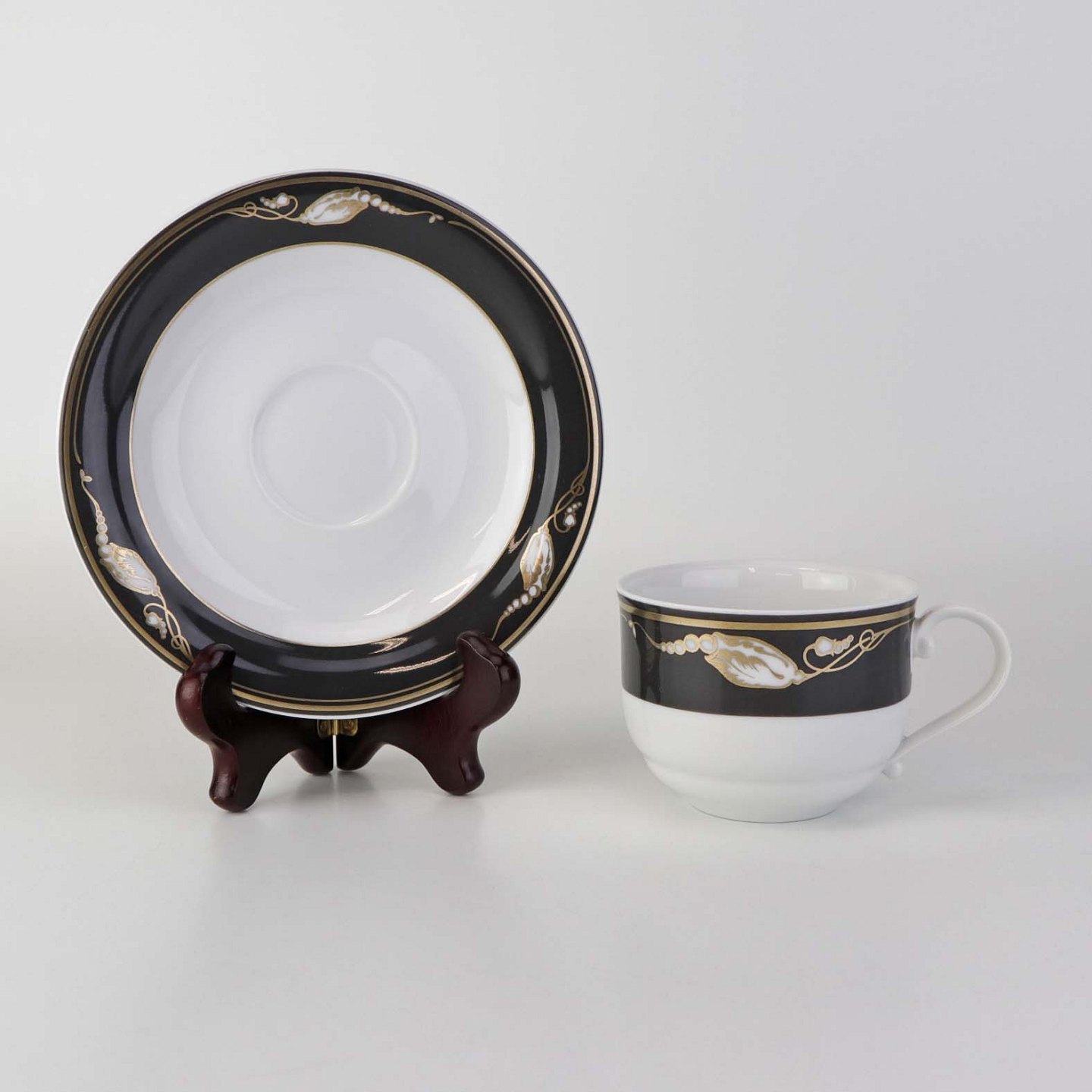 Service i glat hvidt porcelæn dekoreret med sort bort og gylden blomsterknop.