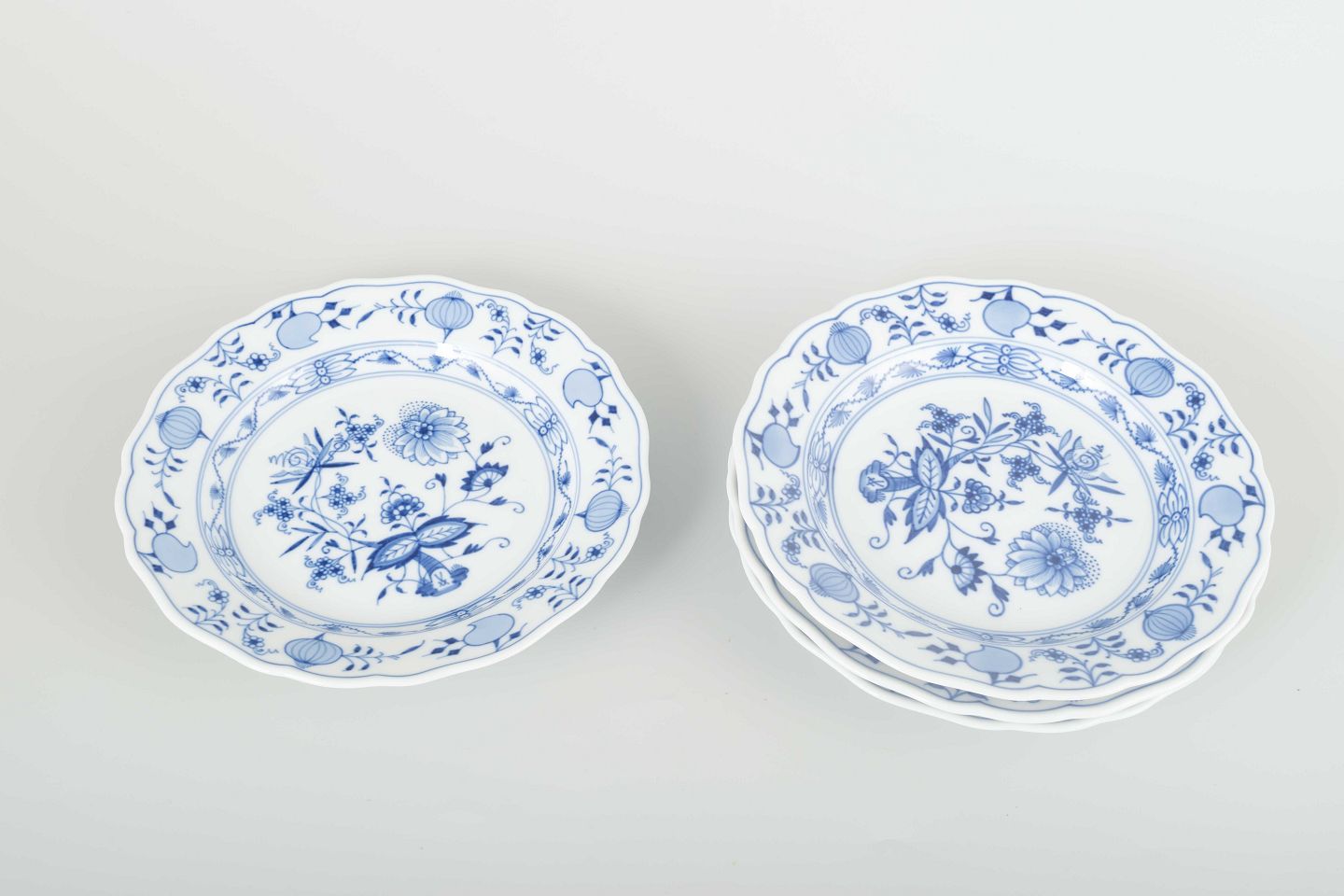 Four hand-painted porcelain plates in the classic “Blue Onion” pattern. Decorated in underglaze blue with a scalloped rim and elegant ornamentation.