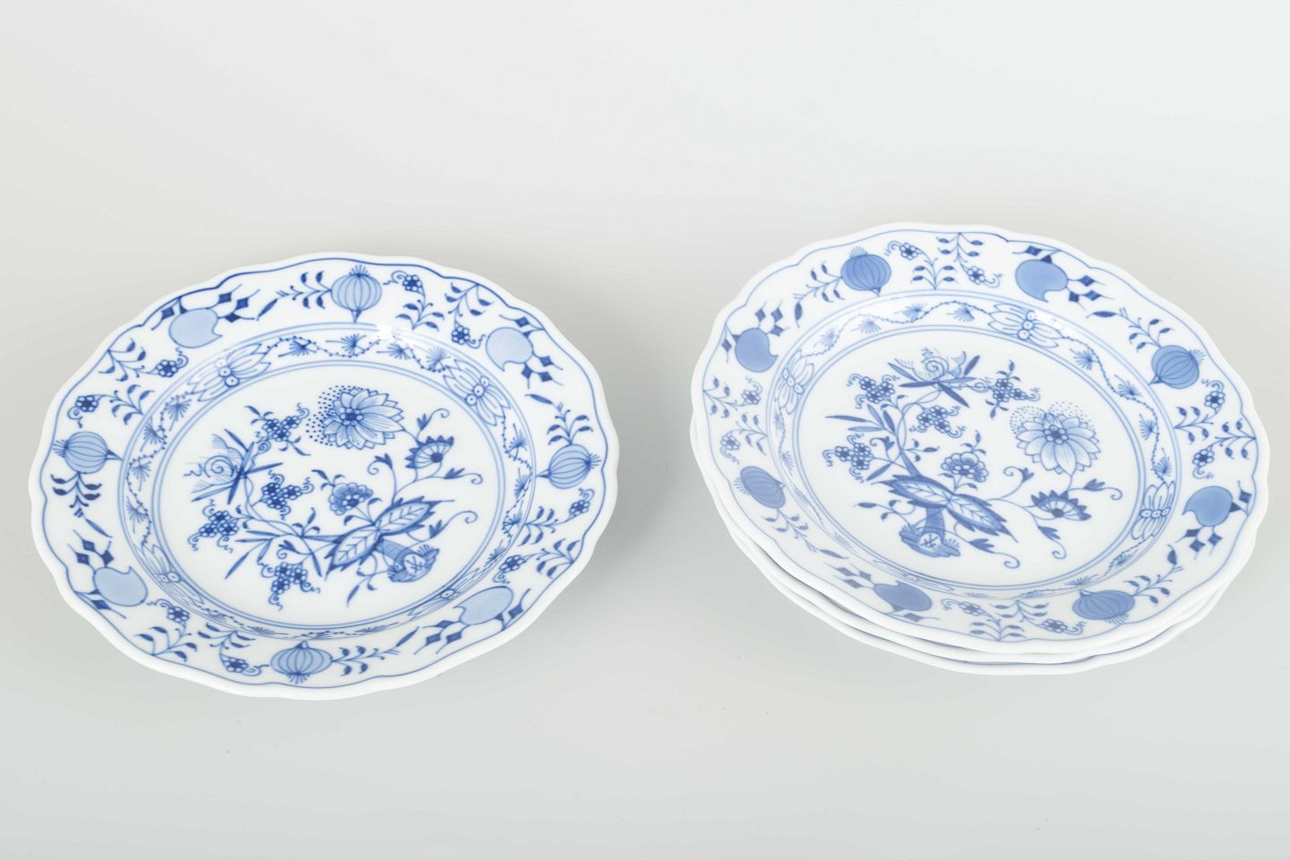 Four hand-painted porcelain plates with underglaze blue “Blue Onion” decoration, scalloped rims and refined floral detailing.