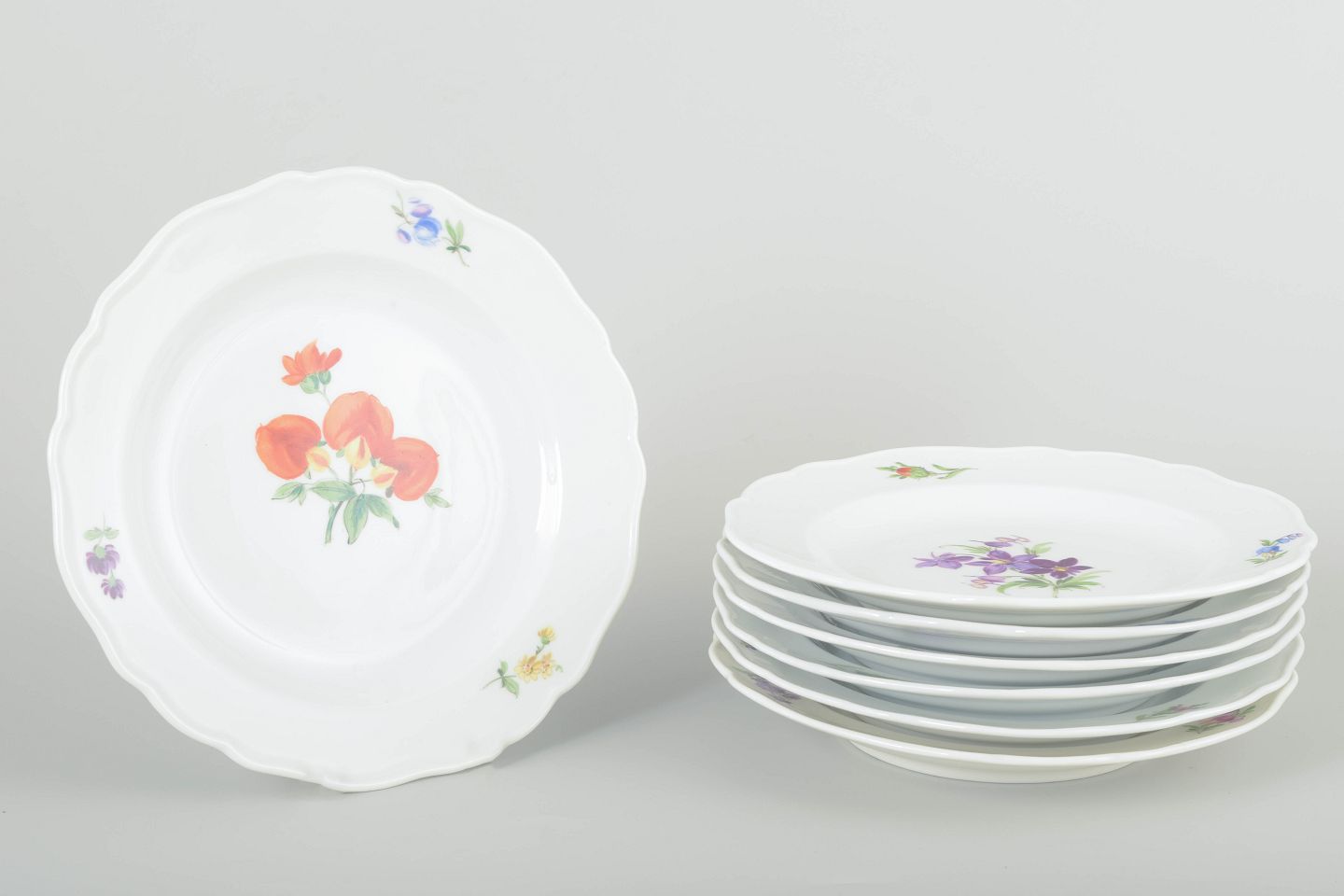 Seven porcelain plates, hand-painted with multicoloured floral decorations. Classic scalloped rim with relief and delicate detailing.