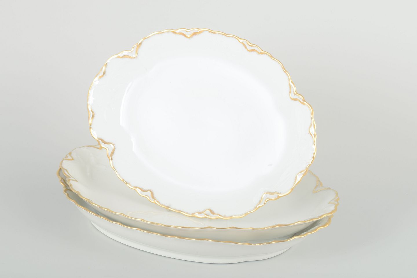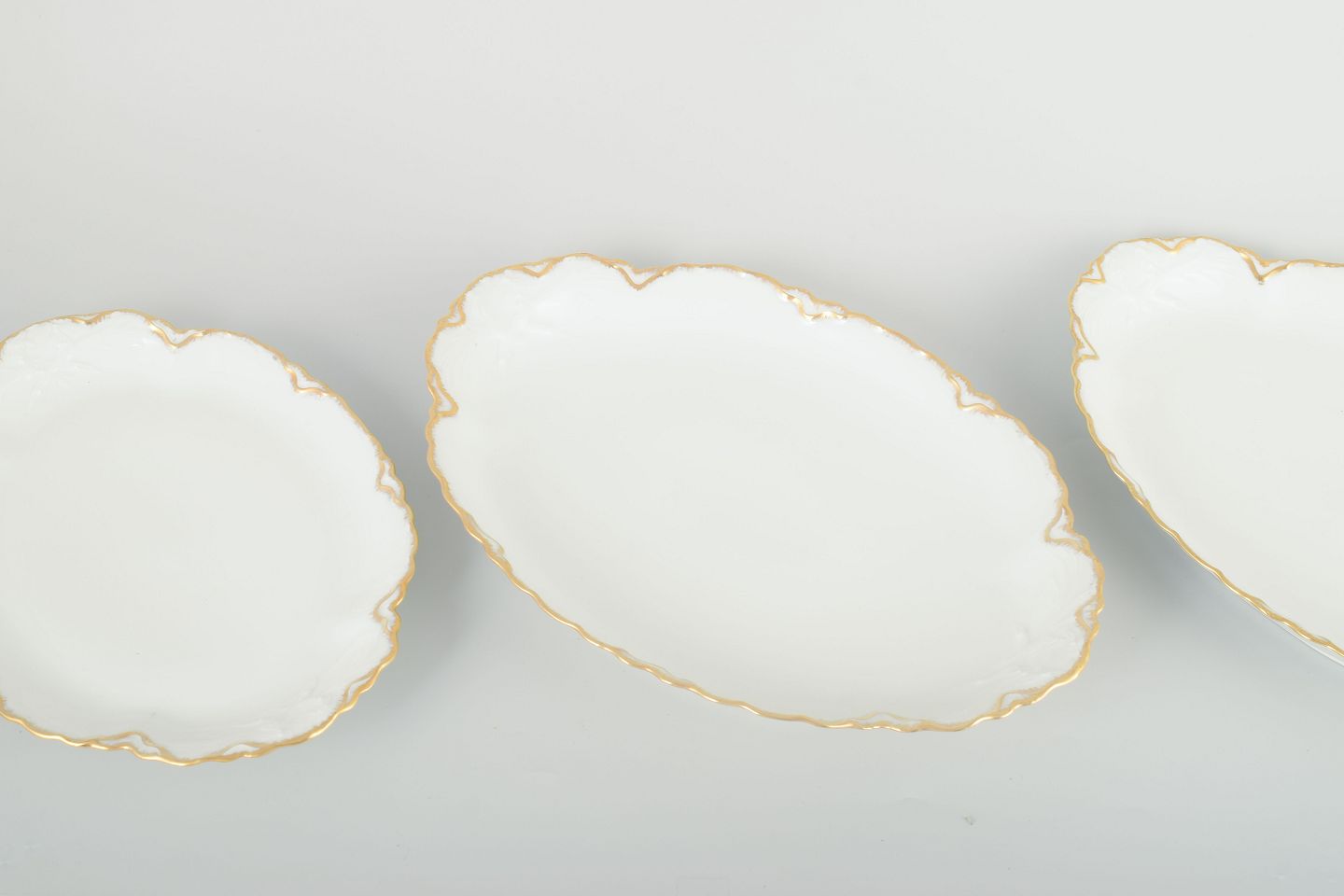 Elegant set of oval porcelain dishes in a warm cream tone with hand-painted gold edging and softly scalloped forms. A fine example of classic French tableware with subtle Art Deco influence.