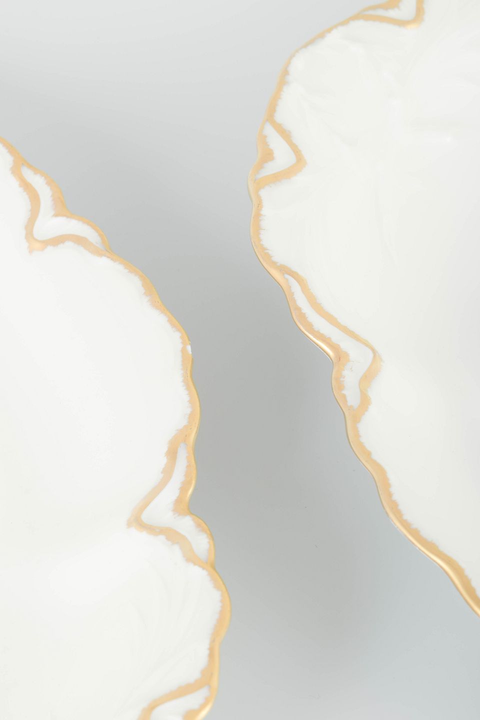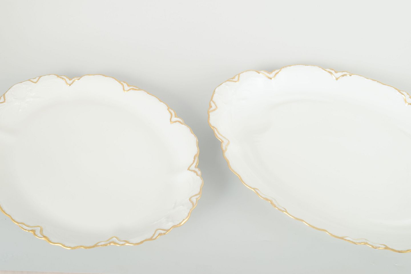 2 oval dishes, 1940s.Elegant pair of oval porcelain dishes in a warm cream tone with hand-painted gold edging and gently scalloped forms. A fine example of classic French tableware with subtle Art Deco influence.