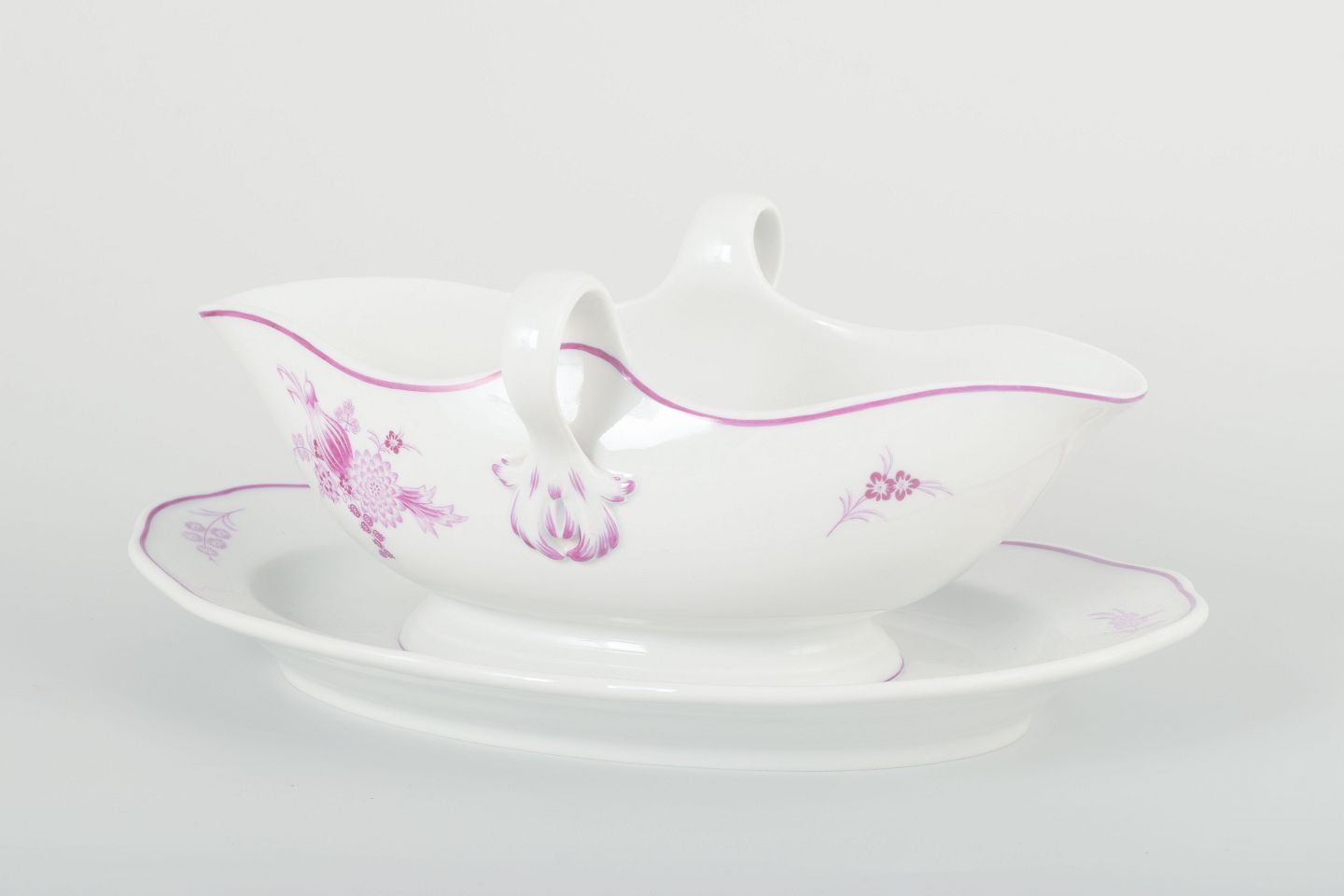 Hand-painted porcelain sauce boat with fixed tray and double spout, decorated with lilac floral compositions and elegant pink edging. A classic Meissen design combining refined craftsmanship with functional elegance.