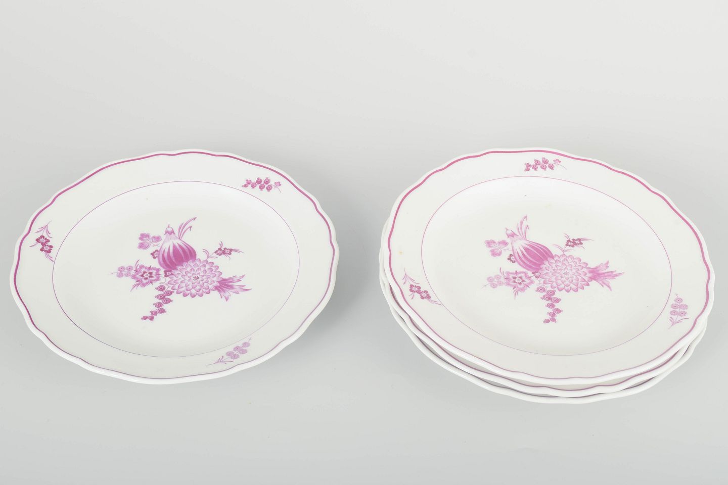Set of four hand-painted porcelain lunch plates decorated with lilac floral compositions and a gently scalloped rim. Classic Meissen design with fine pink-lilac detailing.