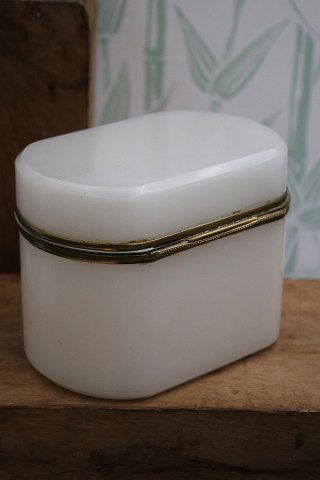 Antique 19th century sugar box in white opal glass with bronze mounting. H: 10.2cm. L&W: 14.5x10cm.Item number: Sukkerskrin nr.2