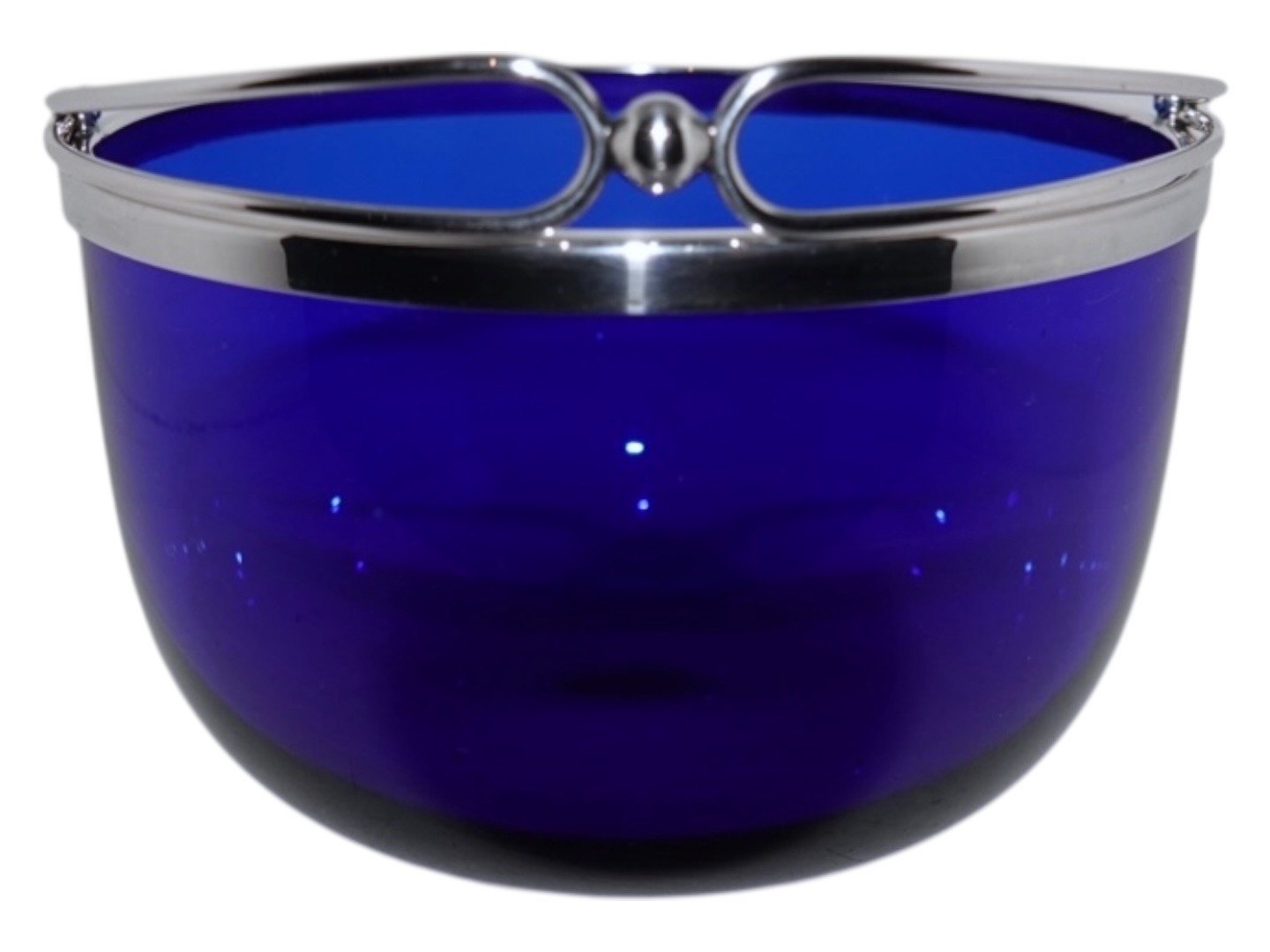 Holmegaard blue glass sugar bowl with silver edge and handle. It is from the 1950'es.The silver was made by silversmith Svend Toxværd. The hallmark is "Sv.T. 830S).